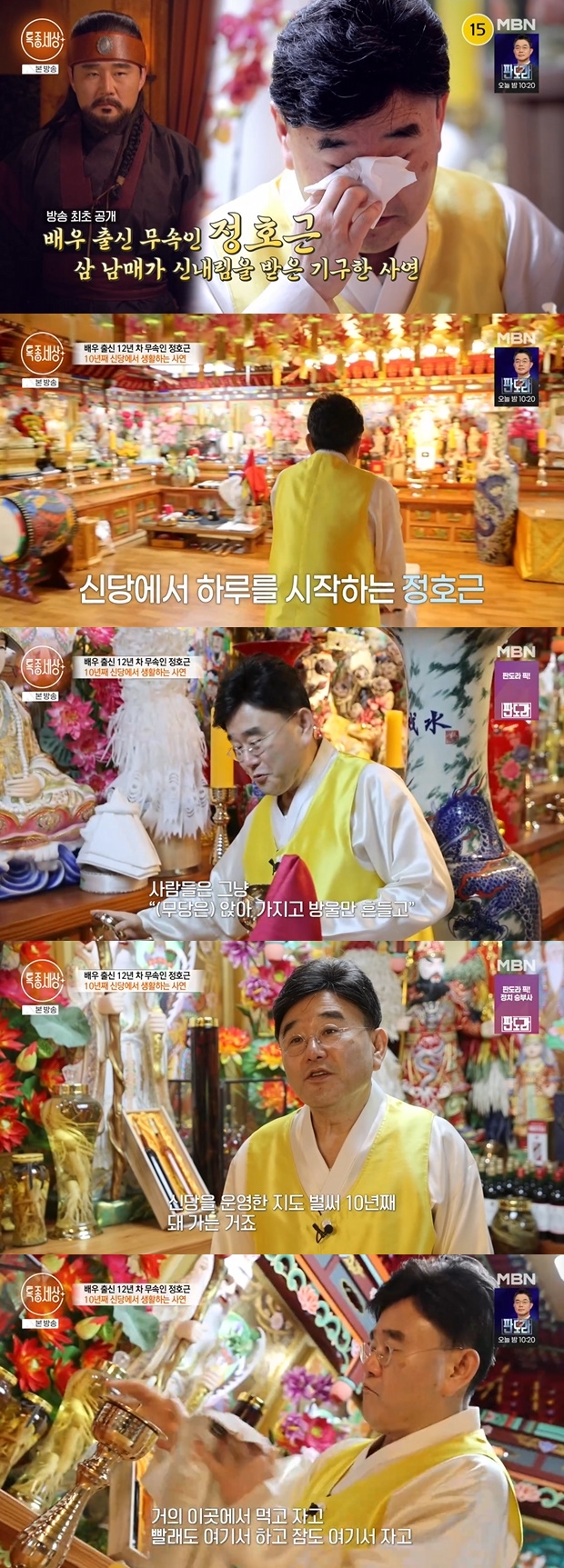 티브이데일리포토[티브이데일리김진석기자]신내림을받은배우정호근이여동생을떠나보낸가슴아픈사연을고백했다.5일방송된MBN예능프로그램'특종세상'에는신내림을받은정호근의근황이공개됐다.그는방송가에서자취를감춘뒤,돌연신내림을받아대중에게충격을안긴인물이다.이날정호근은"신당을운영한지도10년째다.여기서자리를잡고부터는제집이신당이됐다.먹고자고모든일상을신당에서시작하고끝낸다"라고근황을전했다.정호근은신내림을받은당시를회상하며"맨처음에몸이많이아팠다.특히배가너무아팠다.근데병원가면아무이상이없다더라.그리고뭐가귀에서소리가난다.벌나는소리가하루종일들린다.너무괴로웠다.뭐가보이는것이있고들리는게있어정신병인가싶어심각하게생각했다"라고신병을겪은일화를전했다.그는아침밥을먹던중"미국에있는집사람이생각난다.그사람의조리법에의해서만들어진그맛이다.여기서일하는사람도맨처음엔이해를못했는데,그런식으로음식을해줘라고하니비슷하게만들어놓고간다"라고밝혔다.그는"친할머니께서신의제자셨다.집안에신의환란이닥치면한사람만으로도난리가나는데우리집은세명이나그랬다"라며"누나를시작으로여동생,그리고나까지신내림을받게됐다"라고밝혔다.이후그는"지난해여동생이세상을떠났다"라고밝혀안타까움을자아냈다.신병을앓는동생을위해정호근은신당에여동생을데리고와점을보게했고,결국작년부터아파세상을떠났다는소식을덧붙였다.눈물을흘리던그는"모든것이다후회스럽고내탓인것만같아죄의식이생긴다"라며참담한심정을전했다.이후정호근은여동생이있는곳을찾았다.꽃을사들고간그는"너무서러워하지말고,오빠가얘기했듯거기선편안해라"라고담담히전했다.[티브이데일리김진석기자[email protected]/사진=MBN'특종세상']정호근[Copyrightⓒ*세계속에新한류를*연예전문온라인미디어티브이데일리(www.tvdaily.co.kr)/무단전재및재배포금지]Copyright©티브이데일리.무단전재및재배포금지.