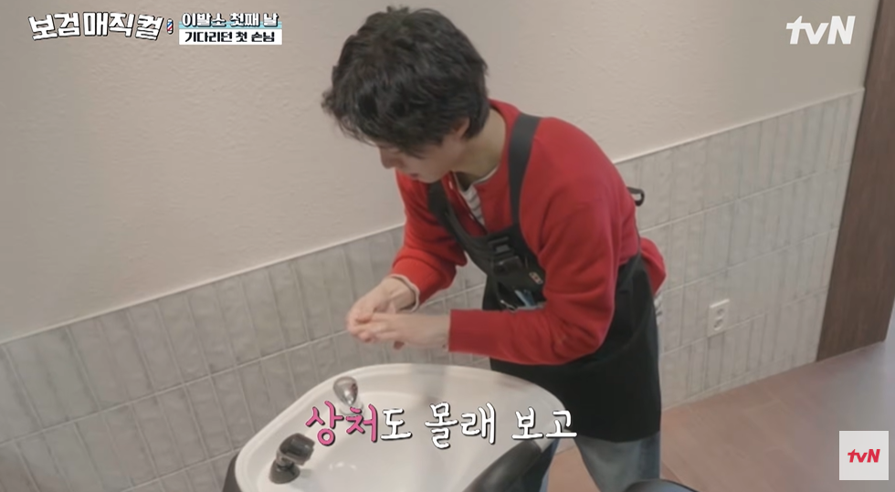 tvN'보검매직컬'방송캡처(엑스포츠뉴스김지영기자)배우박보검이미용실오픈첫날부터가위에손을베이는아찔한상황을겪었다.6일방송된tvN'보검매직컬'에서는무주에서미용실을처음오픈한박보검의모습이공개됐다.이날박보검은오픈첫날첫번째손님을맞이해커트와염색시술을시작했다.그러나첫손님을응대하던중두번째손님이연이어방문하면서박보검은순간당황한기색을보였다.염색을진행하던박보검에게손님은"염색약을구석구석발라도된다"고조언했고,박보검은더욱꼼꼼하게시술하며손님으로부터"잘하네"라는칭찬을받았다.tvN'보검매직컬'방송캡처하지만박보검은50분째기다리고있는두번째손님이신경쓰인다며걱정했고,이에이상이는서둘러두번째손님응대를준비했다.이후첫번째손님의염색을마친박보검은손을씻던중,앞서첫번째손님의커트를하며가위에손을베였던부위를확인하고지혈에나서며당황한모습을보였다.두번째손님인남성손님의커트를이어가던중에도손에서계속피가나는상황에박보검은신경쓰이는듯휴지로지혈하며시술을이어갔다.그러나불편함이커지자밴드를찾으려했지만쉽게보이지않았고,결국이상이에게다친손을내보이며상황을알렸다.tvN'보검매직컬'방송캡처이상이는급히밴드를찾다미끄러졌고,곽동연에게"손을베였다"고해당상황을전했다.이후세사람은응급상자를찾아손님들이놀라지않도록조용히응급처치를진행했고,곽동연은곁에서손님이눈치채지않도록옆에서자연스럽게응대를도왔다.응급처치를마친박보검은밴드를붙인채다시이발을이어가며프로다운모습을보여눈길을끌었다.사진=tvN'보검매직컬'방송캡처김지영기자[email protected]©엑스포츠뉴스.무단전재및재배포금지.