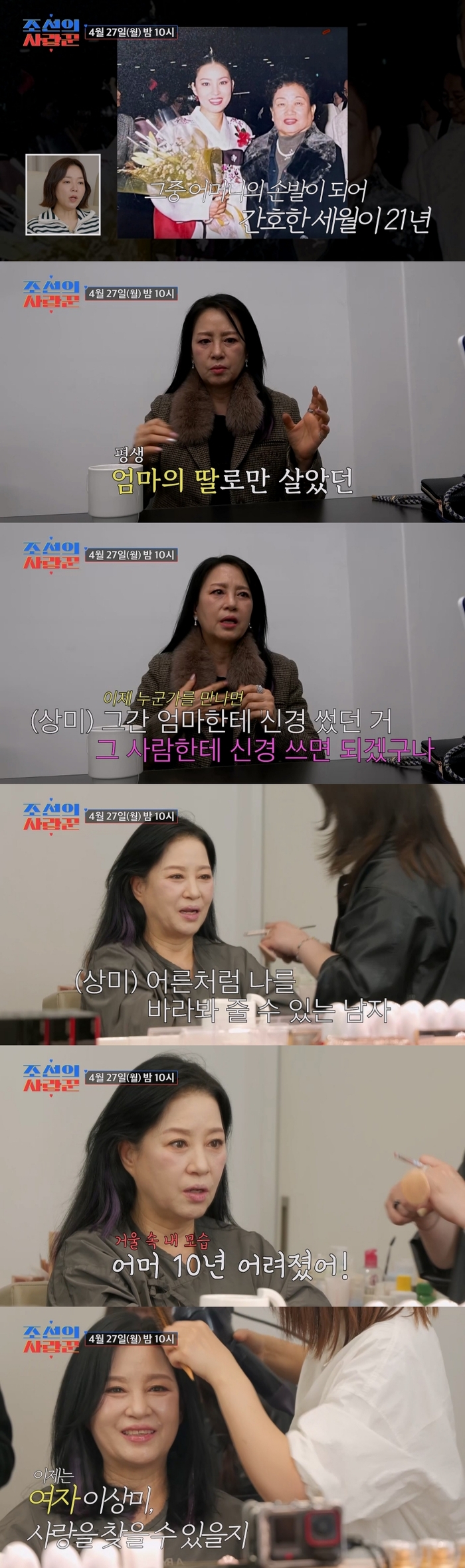 ‘조선의사랑꾼’이상미.사진ㅣTV조선배우이상미가오랜간병의시간을지나,설렘가득한새로운출발선에섰다.27일방송되는tv조선‘조선의사랑꾼’에서는황혼소개팅에나서는이상미의모습이공개된다.이상미는과거전원일기에서‘개똥엄마’역으로사랑받았던배우.그러나화려한작품이면에는21년간어머니를간병해온긴시간이있었다.그는“뇌졸중이후힘든간호를이어왔다”며삶의대부분을가족을위해헌신해왔다고털어놨다.그런그가처음으로‘자신의삶’을향한선택을했다.이상미는“이제는누군가에게신경을쓰며살아보고싶다”며황혼소개팅에나선이유를솔직하게밝혔다.이날방송에서그는새로운만남을앞두고설레는마음을감추지못했다.메이크업을받으며“중요한날이다.더화사하고어려보이게해달라”고말하는모습에서는오랜만에꺼낸‘여성으로서의기대감’이묻어났다.또한이상형에대해“아버지같은마음씨를가진사람,나를어른처럼바라봐줄수있는남자”라고전하며진지한만남에대한바람을드러냈다.메이크업을마친뒤“10년은어려진것같다”고수줍게웃는모습은보는이들에게따뜻한미소를안겼다.이상미의새로운인연이어떤결실로이어질지관심이모인다.해당방송은27일오후10시공개된다.[지승훈스타투데이기자]Copyright©스타투데이.무단전재,재배포및AI학습이용금지