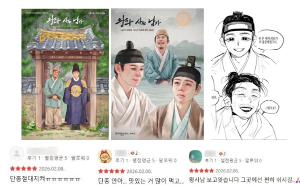 팬아트(Instagram_maygreen_draw/X_gogam1309),단종묘'장릉'댓글(카카오맵)[스포츠한국신영선기자]개봉5일만에100만관객을돌파하며흥행독주중인영화'왕과사는남자'가관객들의폭발적인반응으로화제를모으고있다.개봉이후압도적스코어로박스오피스1위를굳건히지키고있는영화'왕과사는남자'에과몰입한관객들의팬아트와다채로운반응이연일화제를모으고있다.영화'왕과사는남자'는1457년청령포,마을의부흥을위해유배지를자처한촌장과왕위에서쫓겨나유배된어린선왕의이야기를담았다.먼저,광천골촌장엄흥도(유해진)와유배된어린선왕이홍위(박지훈)의모습이담긴공식포스터를똑같이따라그린팬아트가눈길을끈다.정겨운사람냄새가물씬느껴지는엄흥도의표정과곤룡포를입은이홍위의슬프면서도위엄있는모습을섬세하게그려낸팬아트는두사람이서로에게점차마음을열어가게될과정에대한기대감을더한다.뿐만아니라,서로를바라보는눈빛만으로도진한여운을주는엄흥도와단종의표정을생생하게묘사한팬아트는영화가전할깊은울림을예고하며,유해진과박지훈이선보일빛나는연기앙상블에대한호기심을고조시킨다.이렇듯'왕과사는남자'속캐릭터들의개성과특징을섬세하게포착한다양한팬아트들은영화를향한깊은애정과진한여운을짐작하게한다.뿐만아니라지도앱의리뷰기능을이용하여단종묘'장릉'과세조묘'광릉'에직접댓글을남기는유행이번지고있어화제를모으고있다.관람객들은단종묘'장릉'에는"단종절대지켜ㅠㅠ"(카카오맵,김****),"단종안아…맛있는거많이먹고…"(카카오맵,채****),"왕사남보고왔습니다.그곳에선편히쉬시길"(카카오맵,혜****),"영화'왕과사는남자'로인해단종이훗날많은이들에게기억되었음함"(카카오맵,S****),"역사를기억하고있습니다"(카카오맵,희****)등어린나이에왕위에서폐위되어험한유배길에오른단종을향한위로의메시지를남기고,세조묘'광릉'에는분노의댓글을남기며<왕과사는남자>를향한뜨거운과몰입을보이고있다.이처럼,관객들의각양각색팬아트와리얼한반응은'왕과사는남자'를향한뜨거운사랑과인기를실감케한다.개봉5일만에100만관객을돌파하며흥행청신호를밝힌영화'왕과사는남자'는극장에서절찬상영중이다.스포츠한국신영선기자[email protected]©스포츠한국.무단전재및재배포금지.