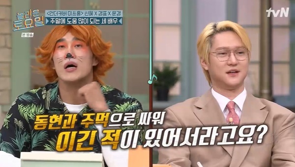 tvN‘놀라운토요일’tvN‘놀라운토요일’[뉴스엔유경상기자]고경표가김동현을주먹으로이긴적이있다고자랑했다.2월7일방송된tvN‘놀라운토요일’에서는‘언더커버미쓰홍’박신혜,고경표,하윤경이출연했다.붐이“김동현을주먹으로이겼다고?”라고묻자고경표는예능프로그램‘식스센스’에서함께펀치머신을칠기회가있었다며“가벼운마음으로쳤는데제가이겼다”고자랑했다.김동현이“공식적으로그게”라며변명하려하자붐이“공식적으로물펀치라고나온거냐”고공격했고김동현은실제로격투기를할때는가볍게친다며“진짜세게치면허점이생긴다.가볍게툭치다보니까”라고변명했다.고경표는“그때는어깨부상을말했는데변명이바뀌었다”며김동현의말이바뀌었다고꼬집었고,김동현은뒤늦게“아그때어깨가안좋았다”고말을바꿨다.고경표는“아무래도자랑스러운이력이된것같다.김동현형이워낙대단하시니까”라고자부했고김동현은“스트레스많이받고있다”며본인의밈을활용해웃음을안겼다.(사진=tvN‘놀라운토요일’캡처)뉴스엔유경상yooks@기사제보및보도자료[email protected]ⓒ뉴스엔.무단전재&재배포금지Copyright©뉴스엔.무단전재및재배포금지.
