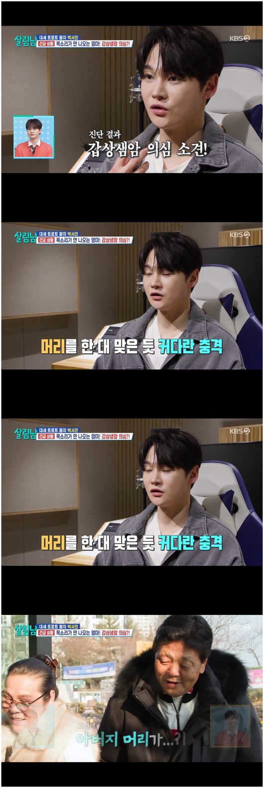 [텐아시아=조나연기자]사진=KBS2'살림하는남자들시즌2'가수박서진이자궁경부암완치판정을받은어머니의또다른암소식에걱정과불안을내비쳤다.7일방송된KBS2예능'살림하는남자들시즌2'에서는오랜시간불면증을겪어온박서진이가족을향한걱정으로또다시잠을이루지못하는모습이그려졌다.이날방송에서박서진은자궁경부암을완치한어머니가최근갑상샘암의심소식을듣고충격을받은사연을전했다.그는"머리를한대맞은느낌이었다"며불안과걱정에휩싸인마음을고백했다.박서진은"엄마가어느날부터목소리가안나오더라.쇳소리가날정도였다.목에혹이있어병원에갔는데,갑상샘암도의심이된다며조직검사를권하셨다.머리를한대맞은느낌이었다"고털어놨다.사진=KBS2'살림하는남자들시즌2'자궁경부암완치판정을받은지2년밖에되지않은상황에서또다시들려온소식에박서진은과거어머니의투병시절을떠올렸고,또아버지의뇌혈관질환과동생효정의건강문제까지겹치며마음속걱정과불안이커져최근불면증이다시심해졌음을고백해안타까움을안겼다.걱정이깊어지는밤,박서진은야식을먹고있는효정을발견하고동생을향해버럭소리를지르고마음에도없는이야기만했다.결국상처를받은효정은끝내집을나가겠다며가출을선언하고,홀로버스정류장에앉아눈물을흘리는모습이공개돼안타까움을자아냈다.사진=KBS2'살림하는남자들시즌2'하지만박서진의마음을알지못한여동생효정은새벽2시몰래두바이쫀득쿠키를먹고있었다.이를발견한박서진은"왜또관리못하고이시간에먹냐.엄마랑똑같다.다너때문이다"며효정을호통쳤다.효정은분노와서운함을감추지못하고"나삼천포가겠다.나찾지마라"며가출을선언했다.날이밝자효정은실제로짐을싸고버스정류장으로향했고,이를뒤늦게알게된부모님이급히삼천포로달려왔다.부모님은효정을달래며박서진을향해혼내기도했지만,결국가족은화해하며사건은일단락됐다.이날방송은시청자들에게가족간갈등과애정이교차하는현실적인모습을보여주며큰공감을얻었다.조나연텐아시아기자[email protected]©텐아시아.무단전재및재배포금지.