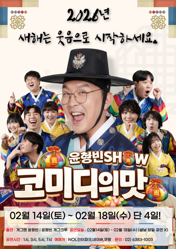 윤형빈쇼,설특집공연(사진=윤소그룹)개그맨윤형빈이설연휴를맞아온가족이함께웃을수있는공연을준비했다.11일콘텐츠제작사윤소그룹은"오는14일부터18일까지홍대케이팝스테이지에서'윤형빈쇼코미디의맛'설특집공연을연다"고밝혔다.'윤형빈쇼코미디의맛'은20년넘게무대위에서코미디를해온개그맨윤형빈과윤형빈개그크루가웃음을전하는공연이다.특히이번설특집공연은명절의즐거움을사랑하는사람들과함께하길바라는마음으로기획됐다.방송에서는볼수없는생생한라이브공연의묘미를관객들에게전달할예정이다.공연은설연휴기간인오는14일부터18일까지열린다.14일은오후1시와3시,5시등총3회공연이예정돼있으며,이어지는15일과16일,18일에는오후1시부터7시까지하루총4회차에걸쳐관객들을만난다.설당일인17일은공연을진행하지않는다.개그맨윤형빈은"설연휴를맞이해준비한'윤형빈쇼코미디의맛'은관객과직접소통하며호흡하는소극장공연의장점을극대화했다"며"웃음까지함께챙겨야진정한'새해복'이완성된다는마음으로,관객들이새해를활기차게시작할수있도록최선을다해웃겨드리겠다"고전했다.온가족에게잊지못할추억을선사할이번'윤형빈쇼코미디의맛'설특집공연은NOL티켓(인터파크)과네이버예약을통해예매가진행중이다.서정민기자bnt뉴스연예팀기사제보[email protected]©bnt뉴스.무단전재,재배포및AI데이터활용금지