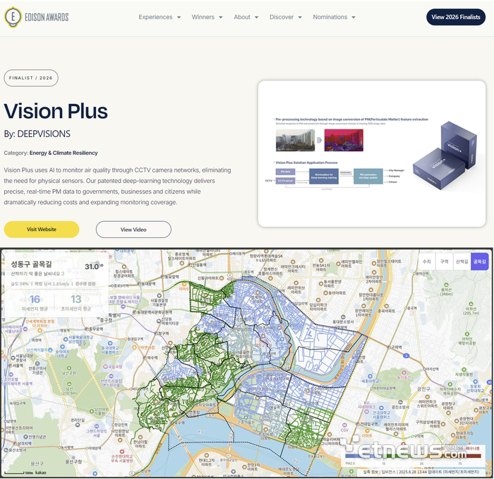 에디슨어워즈2026홈페이지'파이널리스트'화면(위)과성동구CCTV를AI가분석해제공되는미세먼지지도서비스.인공지능(AI)영상분석전문기업딥비전스(대표강봉수)는세계최고권위혁신상으로평가받는EdisonAwards2026에서파이널리스트로공식선정됐다고10일밝혔다.특히Energy&ClimateResiliency부문은3개의업체에만주어지는상이라더욱특별하다.에디슨어워즈는발명가토머스에디슨이름을딴글로벌혁신시상식으로,에너지·기후·헬스케어·AI등지속가능한인류미래에이바지하는기술과제품을엄격한심사를통해선정한다.파이널리스트선정은기술혁신성,사회적영향력,시장확장가능성등다각적인평가를통과했음을의미한다.이번에선정된기술'비전플러스'는이미설치된CCTV이미지를AI가학습및분석해미세먼지농도를측정하는기술이다.측정된데이터를기반으로미세먼지지도를시각화한서비스를제공하고있다.최근미세먼지에대한글로벌수요처들과연결돼영국,독일,프랑스등에PoC를진행하는과정이다.딥비전스는앞서CES2024에서혁신상을수상하며세계시장에서기술력을인정받았고,최근에병충해탐지솔루션,건설안전감지솔루션등다양한비전AI기술확장도집중하고있다.강봉수딥비전스대표는“에디슨어워즈Energy&ClimateResiliency부문파이널리스트선정은딥비전스의비전AI기술이단순한분석기술을넘어,기후변화대응과지속가능한사회구현에이바지할수있는글로벌솔루션임을인정받은결과”라며“이번선정을계기로글로벌시장에서협력과사업확장을더욱가속화할계획”이라고밝혔다.에디슨어워즈2026파이널리스트명단은에디슨어워즈공식홈페이지를통해확인할수있으며,최종수상결과는추후공식발표될예정이다.김현민기자[email protected]©전자신문.무단전재및재배포금지.