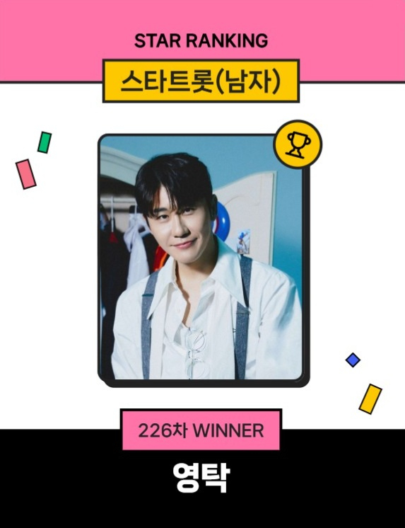 [스타뉴스|김나연기자]영탁/사진=스타뉴스가수영탁이스타랭킹스타트롯남자투표왕좌를지켰다.영탁은지난4일오후3시1분부터11일오후3시까지진행된226차스타랭킹스타트롯남자랭킹투표에서20만8898표를얻으며1위를차지했다.이어박서진이17만3508표를얻으며2위를기록했고,이찬원이3만5626표로3위에올랐다.이어장민호(2만7476표),임영웅(7916표)이TOP5를기록했다.영탁은최근전국투어'2025영탁단독콘서트<TAKSHOW4>(이하'TAKSHOW4')'를성공적으로마무리했고,서울앙코르콘서트를발표했다.앙코르공연'탁쇼4앙코르'는내년1월9일부터11일까지서울잠실실내체육관에서개최된다.또한오는20일서울영등포구여의도KBS신관공개홀에서개최되는'2025KBS연예대상'에서김연자와함께축하무대를꾸민다.한편스타랭킹은팬들이직접자신의최애스타에투표해순위를결정하는랭킹투표다.모바일에서투표를할경우투표인증서도받을수있고투표결과순위에따라스타에게다양한특전이제공된다.4주연속1위로선정된스타는옥외전광판광고에실린다.4주연속1위스타의팬들은옥외전광판광고영상팬서포트도가능하다.제안은스타뉴스공식이메일([email protected])로하면된다.김나연기자[email protected]©스타뉴스&starnewskorea.com,무단전재및재배포금지