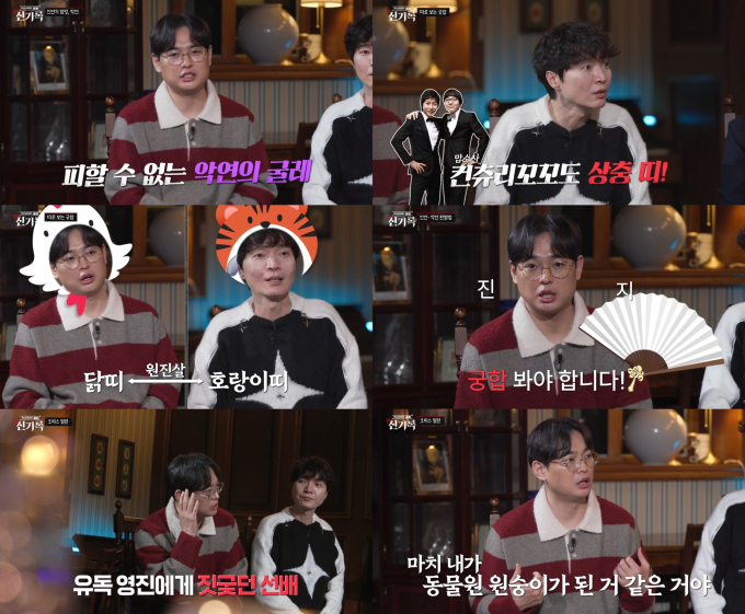 ‘미스터리클럽신기록’신정환·탁재훈,띠궁합공개(제공:코미디TV)코미디TV에서방영중인괴담토크쇼‘미스터리클럽신기록’은실제무당들의오싹한이야기와감초MC들의재치있는진행으로매회재미를더하고있다.‘미스터리클럽신기록’8회에서는‘악연’을주제로,단순한불운을넘어서로의삶을파괴하고파국으로치닫게하는저주받은인연에대해집중조명한다.연인부터가족,직장등일상곳곳에숨어있는다양한악연의이야기가공개되며시청자들의몰입을높인다.이날방송에서띠별궁합테스트가공개돼눈길을끌었다.특히신정환은과거컨츄리꼬꼬시절함께했던탁재훈과의관계에는정반대성향으로만나기만하면부딪친다는이른바‘상충살’이,현재호흡을맞추고있는박영진과의관계에는서로미워한다는‘원진살’이나타나경악을금치못했다.하지만원진살은일명‘사랑살’이라하여,쉽게끊을수없는애증의관계라는해석이더해져위기를맞은두사람의관계가어떻게변화할지관심이쏠린다.이어연인관계궁합도화두로떠올랐다.아내와4살차인박영진은"4살차이는궁합도안본다지만,궁합꼭봐야한다"며기존통념을반박해촬영장을웃음바다로만들었다.반면띠동갑이라는신정환부부의궁합풀이에서는박영진이부러움을드러내며현장의웃음을자아내기도했다.또한직장내악연사연이공개되자박영진은깊이공감하며,과거개그맨선배에게공개적으로모욕을당했던설움과현타의순간을고백해안타까움을자아내기도했다.한국고유의영적세계관을바탕으로한차별화된오컬트토크쇼‘미스터리클럽신기록’여덟번째이야기는7일토요일밤12시,코미디TV에서방송된다.이다미기자bnt뉴스연예팀기사제보[email protected]©bnt뉴스.무단전재,재배포및AI데이터활용금지