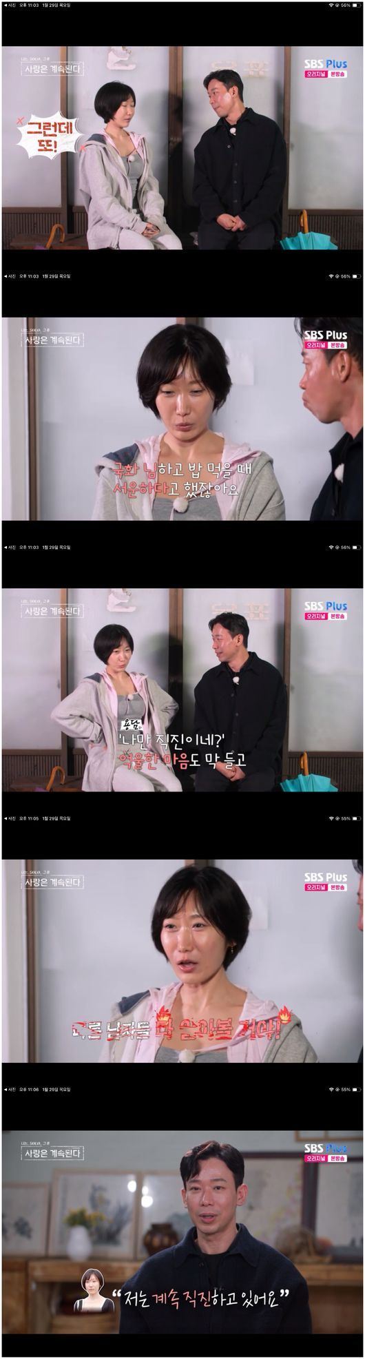 '나솔사계'29일방송SBSPlus'나솔사계'캡처(서울=뉴스1)이지현기자=용담이애교가득한매력을뽐냈다.29일오후방송된ENA,SBSPlus예능프로그램'나는SOLO,그후사랑은계속된다(나솔사계)'에서는용담이호감있는26기경수그리고28기영수와다대일데이트를즐겼다.이들이먹음직스러운음식을앞에두고심야데이트에나섰다.특히용담이"공주가하나먹어볼게요?"라는말과함께오징어순대를시식했다.'공주'얘기에남자들이당황하면서도귀엽게바라봤다.SBSPlus'나솔사계'캡처26기경수가28기영수를향해"한세분마음에있다고했나?"라며궁금해했다.28기영수가"어제는그랬는데,지금두분으로좁혀졌다"라고밝혔다.26기경수가"저도두분으로바뀌었다"라고솔직히털어놨다.이를듣던용담이"공주가빠진건아니죠?"라며깜짝놀라물어봤다.자신의매력을그에게어필한것."빠지진않았다"라는26기경수의대답에는안도했다.앞서26기경수는용담을비롯해국화,백합에게호감이있었다.그러나백합이22기상철로마음을정하면서이사실을솔직히고백했었다.26기경수는"마음에두고있던분에게가서물어봤다"라고솔직하게전했다.이에용담이"상대방결정에따라서마음이왔다갔다하는편이냐?"라고물었다.26기경수가"그렇진않다.세분호감이어느정도다비슷했는데,나머지분들에게더집중하기위해판단한것"이라고해최종선택에궁금증을높였다[email protected]©뉴스1.Allrightsreserved.무단전재및재배포,AI학습이용금지.