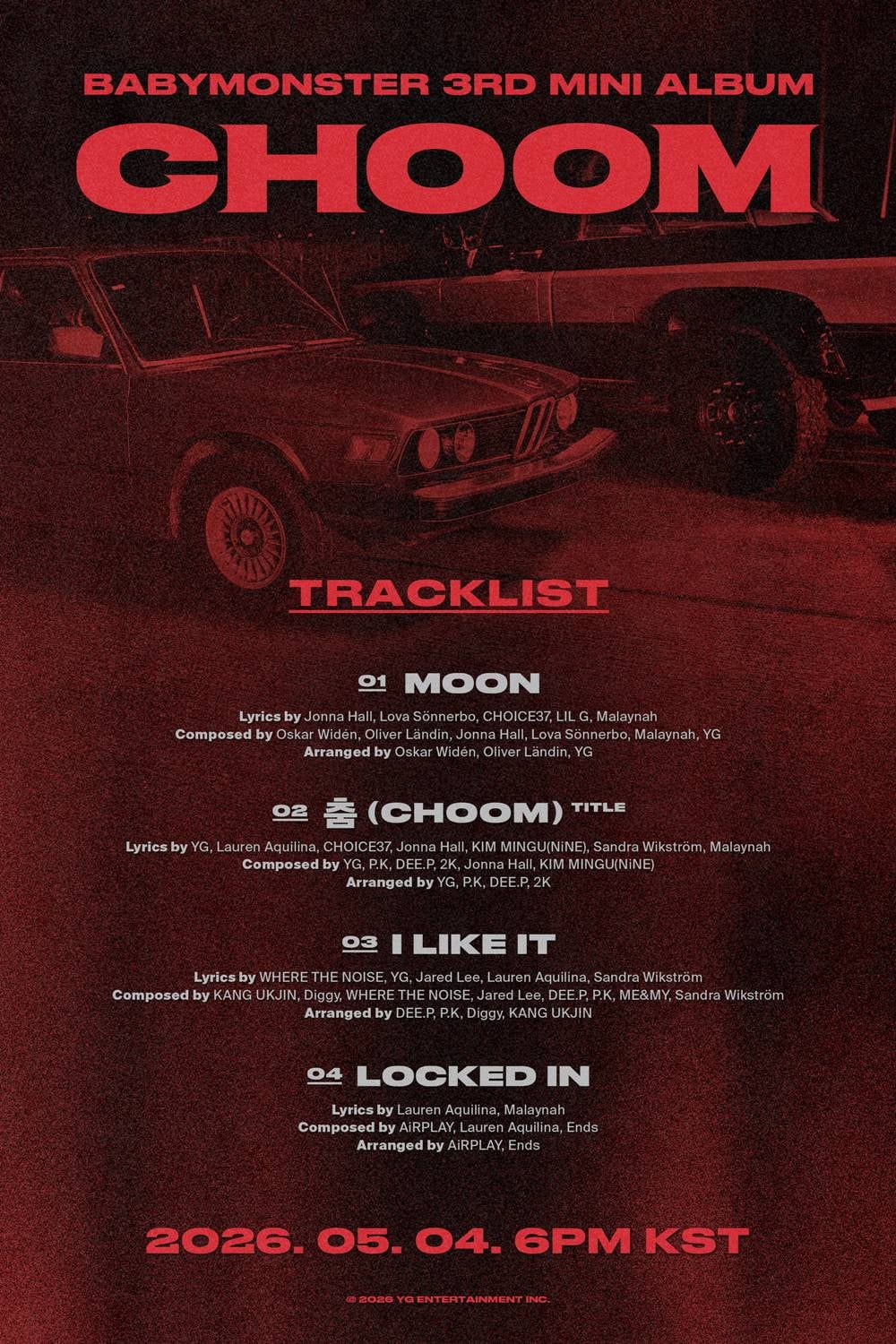 [텐아시아=김지원기자]베이비몬스터새앨범트랙리스트와크레딧/사진제공=YG그룹베이비몬스터가새앨범트랙리스트와크레딧을공개했다.20일YG엔터테인먼트에따르면베이비몬스터의미니3집[춤(CHOOM)]에는첫번째트랙'MOON'을시작으로타이틀곡'춤(CHOOM)','ILIKEIT','LOCKEDIN'까지총4개의신곡이담겼다.그간베이비몬스터와음악적시너지를자랑해온YG의프로듀서진이또한번의기투합했다.여기에정규1집[DRIP],미니2집[WEGOUP]에서호흡을맞췄던해외유수의작곡진까지지원사격에나섰다.YG측은"힙합·댄스·R&B등베이비몬스터의폭넓은스펙트럼과한계없는음악적역량을확인할수있는앨범"이라며"특히타이틀곡'춤(CHOOM)'은제목에걸맞은다이내믹한비트와더욱강렬해진퍼포먼스가준비됐으니기대하셔도좋을것"이라고전했다.이날공개된포스터는노이즈섞인레드톤배경과볼드한타이포그래피로예사롭지않은분위기를자아냈다.특히앞선모션티저에이어이번에도등장한자동차는새앨범콘셉트와어떤연관성을지닐지궁금증을키웠다.베이비몬스터는오는5월4일오후6시미니3집[춤(CHOOM)]을발매하고컴백한다.또한오는6월서울을시작으로아시아,오세아니아,유럽,북미,남미까지총5개대륙을아우르는월드투어를전개한다.김지원텐아시아기자[email protected]©텐아시아.무단전재및재배포금지.