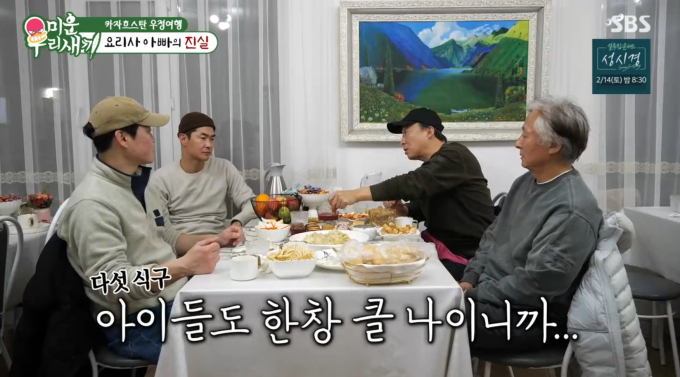 ‘미운우리새끼’(미우새)8일방송된SBS예능‘미운우리새끼’(미우새)에서는카자흐스탄으로우정여행을떠난배우이성민,김종수,김성균,배정남의두번째이야기가공개됐다.이날콜사이호수의절경과절벽그네를즐긴네사람은현지인이운영하는게스트하우스를찾아푸짐한저녁만찬을즐겼다.‘미운우리새끼’(미우새)따뜻한현지가정식을맛보며여행의피로를씻어낸이들은식탁앞에서무장해제된모습을보였다.맛있는음식과함께분위기가무르익자,10년지기다운솔직하고거침없는대화가오갔다.특히서로의재정상황까지가감없이털어놓으며현실적인가장들의고민을나누는등끈끈한우정을과시해눈길을끌었다.소탈한매력이돋보인이들의게스트하우스먹방은시청자들에게훈훈한웃음을선사했다.Copyright©bnt뉴스.무단전재,재배포및AI데이터활용금지