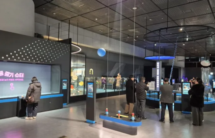 국립중앙과학관‘피직스랩’가보니주파수직접맞추며물결파작품감상어두운인테리어로휴식·공부동시에원심력도360도자전거로온몸체험“어려워도변인조작하며이해유도”22일대전유성구국립중앙과학관의신규전시관‘피직스랩’에서방문객과관계자들이전시물을살펴보고있다.김윤수기자22일대전유성구국립중앙과학관의신규전시관‘피직스랩’전시물‘패러데이웨이브’.김윤수기자[서울경제]천장에달린지름3m짜리원형스크린에서알록달록한꽃무늬의물결파가요동쳤다.방문객들이소파에앉아스크린을올려다보는모습은마치물을하염없이쳐다보며멍때리는유행인이른바‘물멍’을연상시켰다.다만물멍만을위한공간은아니다.스크린속물결파는실제작은접시에담긴물이음파에흔들리는모습을카메라로확대한것으로이를통해생소한개념인파동을쉽게시각화하는게주목적이다.음파주파수를조절하는작은다이얼이있어서돌려봤더니물결파무늬가시시각각변하다가어느순간갑자기크게요동치기도했다.‘공명’현상을눈으로확인한순간이었다.수면에음파를쏘면돌을던진것처럼동그란물결파가생긴다.물결파는음파의충격이닿은수면여기저기에동시다발적으로생기고서로겹쳐져꽃과비슷한무늬를연출한다.음파의주파수,즉떨리는정도를바꾸면물결파의떨림이바뀌고무늬도따라바뀐다.그러다가음파와물결파의주파수가일치하는순간두떨림이서로맞물려크게요동치는공명이발생한다.22일대전유성구국립중앙과학관의새로운전시관‘피직스랩’개관을하루앞두고준비현장을미리가봤다.성인방문객도겨냥한듯어두운인테리어와조명으로아늑한분위기가연출된750㎡공간에서전시물33종은저마다공명같은생소한물리개념하나씩을직관적으로표현하는데초점이맞춰졌다.“기존전시관과달리단순시연을넘어방문객이연구자처럼직접주파수같은변인을조작하며달라지는결과를관찰함으로써자연스럽게과학개념을깨우치도록설계했다”는게권석민중앙과학관장의설명이다.22일대전유성구국립중앙과학관의신규전시관‘피직스랩’전시물‘멈춰진파동'.사진제공=국립중앙과학관‘멈춰진파동’코너에서는아이들이줄넘기처럼위아래로진동하는줄과깜빡이는조명을조작하고있었다.어느순간줄이공중에멈춘것처럼보였다.줄이위아래로흔들리는박자와조명이깜빡이는박자가일치할때나타나는‘스트로보효과’다.가령줄이위로올라갈때만조명이켜지고아래로내려갈때는조명이꺼져서결과적으로우리눈에는줄이위로올라가있는모습만늘보이게되는원리다.옆코너에서는실로폰으로익숙하게연주되는동요가흘러나왔다.실로폰은빛,즉광통신으로작동됐는데누구라도빛줄기하나만막으면곧바로광통신과함께음악도뚝끊겼다.온몸으로과학원리를체감하는액티비티코너들도준비막바지였다.공기의힘으로공중에부양하는‘호버크래프트’를타고작용반작용법칙을,롤러코스터처럼레일을따라360도수직으로회전하는‘원심력자전거’를타고원심력을,사방에서튀어오르는‘베르누이볼’공놀이를통해바람의속도와압력이반비례한다는베르누이법칙을체감하게해놨다.전시물마다설치된디지털사이니지화면에서는인기과학유튜버‘과학쿠키’가체험방법과과학원리를설명하고있었다.피직스랩은중앙과학관이기초과학을경험중심콘텐츠로개편하는새브랜드‘사이언스챕터’의첫시리즈다.중앙과학관은이를통해기존‘쉽고재밌는과학’이아닌‘어렵지만재밌는과학’체험으로국민의과학기술문해력향상에기여하겠다는방침이다.권관장은“변수를스스로조절해가며체험하는방식은머리를써야하고어렵다고느낄수도있다”며“맵지만또먹고싶은‘불닭볶음면’처럼어렵지만재밌는과학이필요하다”고말했다.22일대전유성구국립중앙과학관의신규전시관‘피직스랩’전시물‘마그넷브레이크’.김윤수기자대전=김윤수기자[email protected]©서울경제.무단전재및재배포금지.