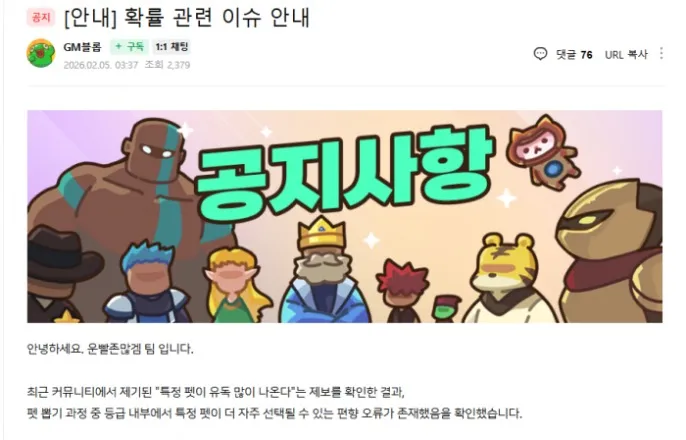 신뢰회복약속과재발방지모니터링강화펫·룬뽑기오류발생,특정캐릭터편향밝혀져111%운빨존많겜공지사항갈무리.국내게임회사111퍼센트(%)의대표게임'운빨존많겜'내펫과룬뽑기에서확률조작논란이발생했다.회사측은재발방지모니터링과재화보상등을진행하겠다는입장이다.운빨존많겜운영팀은5일공지사항을통해"최근커뮤니티에서제기된'특정펫이유독많이나온다'는제보를확인한결과펫뽑기과정중등급내부에서특정펫이더자주선택될수있는편향오류가존재했다"고밝혔다.이어운영팀은"무엇보다명확해야할확률시스템에서이러한오류가발생한점에대해무거운책임을느끼며,유저분들에게불편과불신을드린점진심으로사과드린다"고덧붙였다.이번에발생한운빨존많겜내확률오류대상은'펫뽑기'와'룬뽑기'시스템이다.룬뽑기와관련된오류는'룬스톤'을소모한뽑기에서발생했으며펫뽑기와동일한편향오류다.운빨존많겜의펫뽑기는크게'등급결정'과'등급내펫결정'으로나누어진다.이중등급내펫결정단계에서랜덤처리방식의구현문제로순서상가장앞에있는펫이상대적으로더자주등장할수있는편향이발생했다는것이다.운영팀측은"매번신규기능에맞춰새로운로직을도입하고있으나,룬과펫시스템개발과정에서불찰로의도치않은로직이적용됐다"며"현재해당오류를수정할핫픽스업데이트를준비하고있으며,이를통해뽑기로직을정상화해등급내모든아이템이동일한확률로등장하도록수정할예정"이라고설명했다.피해를입은유저들에게'재화보상'과'펫보상선택티켓'을제공할예정이다.펫뽑기및룬스톤소모기록이있는모든유저들에게는게임진행시필요한배터리와룬스톤을보상한다.또,펫보상선택티켓사용시▲보유중인모든펫회수및펫뽑기레벨을초기화하고사용된배터리환급▲확률편차에의해편향이발생한펫의수량을확률에맞게고르게분배해주는펫수량보정▲현재의펫육성상태를유지3가지옵션을선택할수있다.끝으로,운영팀은"이후변경사항이나추가조치사항이생길경우해당공지를통해지속적으로안내할예정"이라며"앞으로더욱책임감있는서비스를약속드리며,유저분들과신뢰를회복하기위해노력하고,다시한번깊이사과드린다"고밝혔다.한편,운빨존많겜은2024년5월출시된모바일타워디펜스게임으로출시직후양대마켓인기및매출순위1위를석권했고,글로벌누적다운로드1100만건이상을기록하는성과를내는등흥행에성공했다.김세현기자[email protected]©뉴스웨이.무단전재,재배포,AI학습이용금지