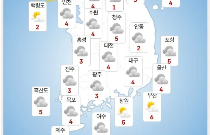 기상청=오늘오전날씨오늘(15일)날씨는전국이대체로흐리다가밤에가끔구름많겠다.중부지방·전라권·경상권서부지역은밤부터차차맑아지겠다.미세먼지농도는수도권·강원영서·충청권에서농도가'나쁨'수준을보이겠다.강원영동은오후에,호남권·영남권은오후부터,제주권은밤에'나쁨'으로나타나겠다.대기가정체된중부지역에잔류미세먼지가축적된가운데북서기류를타고온국외미세먼지가유입되면서오후엔대부분지역의농도가높아질것으로예상된다.새벽부터아침사이서쪽지역을중심으로가시거리1km미만의안개가끼는곳이있겠고,오후낮은구름이유입되는강원산지에는가시거리200m미만의짙은안개가끼는곳이있겠다.특히,해안에위치한교량과내륙의강이나호수,골짜기에인접한도로에서는안개가더욱짙게끼는곳이있겠으니,차량운행시감속운행하여추돌사고등의피해가발생하지않도록교통안전에유의해야겠다.기상청오늘날씨예보에따르면당분간기온은평년(최저-3~5도,최고10~14도)과비슷하겠다.아침최저기온은0~6도,낮최고기온은10~16도가되겠다.기상청=오늘오후날씨경기동부와강원내륙.산지,경북내륙,내일(16일)은전국내륙을중심으로아침기온이0℃이하가되겠고,내일은전국내륙을중심으로낮과밤의기온차가15℃안팎으로크겠으니,건강관리에유의해야겠다.전국주요도시별예상최저기온은△서울4도△인천4도△춘천1도△강릉5도△대전4도△대구4도△전주3도△광주3도△부산6도△제주6도△울릉도독도4도다.최고기온은△서울13도△인천11도△춘천14도△강릉12도△대전12도△대구14도△전주11도△광주13도△부산15도△제주12도△울릉도독도10도로예상된다.새벽부터아침사이경기남부서해안과충남서해안에0.1mm미만의빗방울이떨어지는곳이있겠고,오후에강원산지와충북,전북동부,경북북동산지에는0.1mm미만의빗방울이떨어지거나,0.1cm미만의눈이날리는곳이있겠다.강원동해안.산지와경북북부동해안.북동산지에눈이쌓여있는가운데,낮동안녹은눈이밤사이다시얼면서빙판길이나도로살얼음(특히,교량과고가도로,터널입.출구)이나타나는곳이있겠으니,교통안전과보행자안전에각별히유의해야겠다.월요일인내일(16일)날씨는전국이가끔구름많겠으나,강원영동과경상권동해안은대체로흐리겠다.아침최저기온은-3~7℃,낮최고기온은10~16℃가되겠다.17일(화)날씨는전국이대체로맑다가밤부터차차흐려지겠으나,강원영동과경상권동해안은대체로흐리겠다.아침최저기온은-3~8℃,낮최고기온은12~17℃가되겠다.기상청=주간날씨예보[email protected]©게임톡.무단전재및재배포금지.