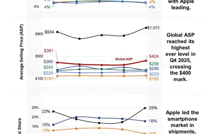 지난햐4분기스마트폰평균가격분기기준처음400달러돌파출하량5%에도고가모델비중확대로ASP증가율은8%상승아이폰평균가1000달러돌파…삼성은보급형모델판매늘어[서울=뉴시스]시장조사기관카운터포인트리서치에따르면지난해4분기전세계스마트폰ASP는전년대비8%상승한424달러로집계됐다.분기기준으로ASP가400달러를넘어선것은이번이처음이다.(사진=카운터포인트리서치제공)*재판매및DB금지[서울=뉴시스]심지혜기자=지난해4분기글로벌스마트폰평균판매가격(ASP)이분기기준처음으로400달러를넘어선것으로나타났다.같은기간글로벌스마트폰시장매출도분기기준역대최고치를기록했다.출하량증가율은5%수준에머물렀지만소비자들의고가모델선택비중확대에따라평균판매가격이오르며전체시장규모를키웠다는분석이다.3일시장조사기관카운터포인트리서치에따르면지난해4분기전세계스마트폰ASP는전년대비8%상승한424달러로집계됐다.분기기준으로ASP가400달러를넘어선것은이번이처음이다.같은기간글로벌스마트폰시장매출은전년동기대비13%증가한1430억달러로분기기준최고치를기록했다.다만출하량은전년대비5%늘어나는데그쳤다.판매대수증가폭은크지않았지만고가제품비중확대와ASP상승이맞물리며매출확대에영향을준것으로분석된다.카운터포인트는스마트폰프리미엄화추세가주요성장요인으로작용했다고설명했다.지속적인메모리부족으로일부지역에서는플래그십스마트폰의조기출시와가격인상이나타났고,이로인해전체ASP가상승했다는분석이다.또연말쇼핑시즌을맞아보상판매와할부혜택이제공되면서선진국과신흥국모두에서고가스마트폰으로의업그레이드가이어졌다.애플,고가모델비중확대…삼성전자는보급형증가이같은시장환경속에서애플은고가모델비중확대와ASP상승으로매출점유율이확대됐다.반면삼성전자는보급형제품판매비중이늘면서출하량은증가했지만,ASP가하락했다.이로인해두기업간매출점유율과ASP격차가같은기간기준더벌어졌다.지난해4분기애플의글로벌스마트폰시장매출점유율은59%로집계됐다.삼성전자는11%로2위를유지했으나두기업간매출점유율격차는전년동월44%p에서48%p로확대됐다.2024년4분기애플의매출점유율은55%,삼성전자는11%였다.ASP의격차도커졌다.애플의ASP는2024년4분기934달러에서지난해4분기1011달러로상승하며분기기준처음으로1000달러를넘어섰다.삼성전자는갤럭시A시리즈등보급형제품판매가늘어나며ASP가260달러에서249달러로4%하락했다.이에따라2024년4분기674달러였던양사간단가격차는지난해4분기762달러까지벌어졌다.애플은지난해4분기출하량과매출이각각전년동기대비14%,23%증가하며분기기준최대실적을기록했다.아이폰17시리즈출시효과와함께프로모델비중확대에따른평균판매가격상승이매출증가로이어졌다는설명이다.반면삼성전자는같은기간매출이전년동기대비12%증가하며매출점유율11%로2위를유지했다.출하량은17%늘어상위5개브랜드가운데가장높은증가율을기록했다.갤럭시A시리즈판매호조와연말프로모션효과,일부지역에서의갤럭시S25와Z폴드7수요가출하량증가에영향을미쳤다.다만보급형제품비중이확대되면서ASP하락으로이어졌다.샤오미는부품가상승부담…스마트폰프리미엄화계속될듯글로벌스마트폰시장점유율3위인샤오미는지난해4분기매출이전년동기대비9%감소했고,출하량도11%줄었다.부품비용상승과공급제약이부담으로작용하면서중국과인도등주요시장에서출하량이줄었다.ASP는3%상승했지만물량감소를상쇄하기에는부족했다는평가다.오포는고가라인업확장에힘입어매출과ASP가각각전년대비23%,6%증가했다.리노14와파인드시리즈판매가실적에반영됐다.중동·아프리카(MEA),중남미(LATAM),아시아태평양(APAC)등신흥시장에서의판매확대도영향을미쳤다.한편글로벌스마트폰시장의프리미엄화추세는이어질것으로전망된다.타룬파탁카운터포인트리서치디렉터는"AI기능에대한수요확대와D램·낸드가격상승영향으로ASP상승흐름은이어질것"이라며"다만메모리와부품원가부담이지속될경우2026년에는출하량이압박을받을수있어,제조사들은포트폴리오개선을통한가치성장에더집중할것"이라고말했다.☞공감언론뉴시스[email protected]©뉴시스.무단전재및재배포금지.