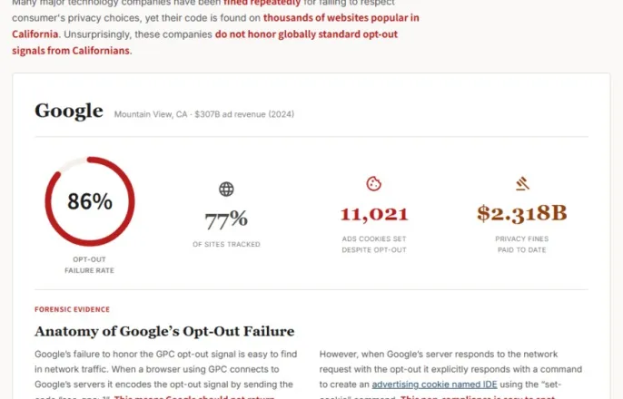 웹엑스레이보고서결과…메타,관련벌금만13조7200억원납부추정웹엑스레이보고서중구글조사내용.(사진=글로벌프라이버시오딧)[더구루=홍성일기자]인터넷이용과정에서마주치는'쿠키허용/거부'배너가장식에불과하다는주장이담긴보고서가나왔다.해당보고서에는미국빅테크가이용자의선택권을상당부분무시하고있다는내용이포함됐다.빅테크들은보고서결과에반론을제시하며,자사기술을잘못해석하고있다고주장했다.16일업계에따르면미국개인정보분석플랫폼'웹엑스레이(webXray)'는보고서를통해거대광고기술기업들이이용자가명확하게거부의사를밝혔음에도,인터넷활동상황을추적하고있다고발표했다.해당보고서는캘리포니아소비자개인정보보호법(CCPA)에따라공개됐다.웹엑스레이는구글개인정보보호엔지니어출신티모시리버트(TimothyLibert)박사가2023년설립했다.웹엑스레이는자체개발한툴을이용해홈페이지코드가수행하는동작을분석해,규정위반여부를조사하고있다.웹엑스레이는지난달캘리포니아에서인기있는웹사이트를중심으로광고정보수집과정에서불법행위가없는지를조사했다.조사결과빅테크들이이용자의거부에도불구하고쿠키정보를수집하고있는것으로확인됐다.쿠키란서버에서이용자의웹브라우저로전송하는텍스트파일로이용자식별,로그인상태유지,개인설정정보등을담고있다.여기에이용자가어떤광고를클릭했는지,어떤페이지를주로보는지등의데이터도포함돼있다.보고서에따르면전체조사대상중55%사이트가이용자가거부의사를밝혔음에도광고쿠키를수집했다.거부의사에도불구하고설정된쿠키는약12만5106개였다.78%사이트는이용자가거부버튼을클릭했음에도,설정변경이이뤄지지않았다.기업별로는구글이86%의요청을무시했으며,77%의경우에는사이트추적이활성화됐다.마이크로소프트(MS)는거부요청중50%가거부됐으며,35%의경우추적까지이뤄졌다.메타의경우69%의거부요청이무시됐다.특히메타의경우에는추적코드가이용자의거부신호를확인하지않은경우도많은것으로나타났다.웹엑스레이는이로인해빅테크들이상당한벌금을내고있다고설명했다.MS의경우지금까지3억9000만달러(약5750억원),구글23억1800만달러(약3조4190억원),메타93억4000만달러(약13조7200억원)을벌금으로지불했을것으로추정했다.이를두고웹엑스레이관계자는"빅테크들이개인정보보호관련벌금을징벌로보는것이아니라사업을위해지불하는일종의세금정도로여기고있다"고꼬집기도했다.보고서가공개되자구글,MS,메타등은보고서가기술적특성을왜곡하고있다며반박입장을내놨다.MS는"일부쿠키의경우웹사이트를정상적으로작동하기위해필요한필수쿠키"라고설명했다.메타는"개인정보보호기술작동방식을왜곡한것"이라며"글로벌프라이버시컨트롤(GPC)는데이터수집자체를막는것이아니라,제3자공유를제한하고있다.광고주들에게적법하게공유권한을획득한데이터만제공하고있다"고말했다.Copyright©THEGURU의모든콘텐츠(영상·기사·사진)는저작권법의보호를받은바,무단전재와복사,배포등을금합니다.