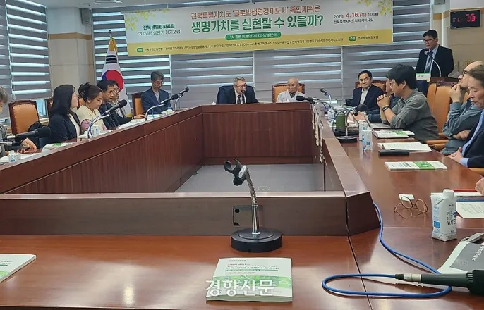 16일전북도의회세미나실에서열린전북생명평화포럼정기포럼에서전문가와시민단체관계자들이전북도종합계획의생태·환경적결함을짚어보고있다.김창효선임기자전북도의최상위법정계획인‘글로벌생명경제도시종합계획’을둘러싸고지역시민·환경단체들이검증에나섰다.‘생명’을전면에내세웠지만기후위기시대에요구되는생태전환전략과지역순환형발전구상은빈약한채규제완화와개발논리를정당화하는수단으로기능하고있다는비판이다.전북생명평화포럼과전북환경운동연합,전북불교미래본부등9개단체는16일전북도의회에서정기포럼을열고계획의철학과실행전략을점검했다.포럼은‘생명경제’개념이정책설계와공간전략,산업구상에어떻게반영됐는지를짚는데초점을맞췄다.전북도는지난달20일‘글로벌생명경제도시’조성을위한중·단기발전전략을담은도단위첫최상위법정계획을확정·고시했다.그러나현대자동차그룹의9조원투자유치등대규모자본유입에관심이쏠리며,계획방향에대한도민공감대와공론화는사실상실종됐다는지적이나온다.포럼에서는‘생명경제’비전이산업중심성장전략으로환원됐다는문제제기가이어졌다.대한불교조계종금산사회주도법스님은“생명은존재방식과관계의문제인데이를성장과개발을정당화하는수식어로사용하는순간본질이훼손된다”며“생태와인간이공존하는‘생명평화공동체’로의전환이계획의출발점이돼야한다”고말했다.유승수전북연구원연구위원의발제에이은토론에서는종합계획의철학적기반과정책정합성문제가집중적으로제기됐다.주요섭전북생명평화포럼공동운영위원장은“생명의복잡성과신비를단순한바이오산업으로환원했다”며생태철학과녹색전환로드맵의부재를지적했다.에너지·농촌대안도제시됐다.오창환새만금도민회의공동대표는송전선로부족과출력제한등구조적병목을짚으며새만금농생명용지영농형태양광도입을제안했다.오공동대표는“농지이용을유지하면서농가소득과지역에너지자립을동시에높일수있다”고말했다.개발중심의공간전략에대한우려도이어졌다.이정현전북환경운동연합공동대표는“550km에달하는해안선을가진전북의수산전략이김양식중심으로단순화돼있다”며“갯벌과연안생태계전반에대한고려가부족하다”고비판했다.이어“산악관광특구가케이블카등시설중심개발로변질할가능성이크고자원순환산업역시명확한기준없이추진될경우전북이이차전지폐기물처리거점으로전락할수있다”고덧붙였다.농업분야에서도비판이이어졌다.조경희전농전북도연맹의장은농업진흥지역해제등규제완화가농지와농촌공동체를훼손할수있다며“종합계획이개발을위한수단으로악용돼서는안된다”고말했다.전북생명평화포럼은“종합계획의실효성은지역사회합의에달려있다”며“생태·환경·농업분야문제의식을바탕으로정책전환을촉구하겠다”고밝혔다.김창효선임기자[email protected]©경향신문.무단전재및재배포금지.