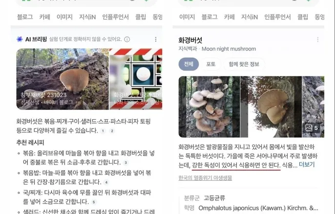 잘못된블로그참조·현재는삭제…네이버"모니터링꾸준히"구글검색AI는정확한답변…"관건은고품질데이터수집"(네이버AI브리핑갈무리)(서울=뉴스1)신은빈기자=네이버(035420)인공지능(AI)검색서비스'AI브리핑'이일부검색어에서잘못된답변을제공한것으로나타났다.사실이확인되지않은블로그정보등을참고하면서오류가발생했다.네이버는문제를인지한즉시해당AI브리핑결과를삭제했고저품질문서탐지기술을강화하겠다는입장이다.AI브리핑에독버섯레시피버젓이…블로그기반오류8일정보기술(IT)업계에따르면한때네이버에'화경버섯레시피'를검색했을때AI브리핑에는별도주의문구없이다양한레시피가추천됐다.화경버섯은식용이불가능한독버섯으로,네이버에'화경버섯'만검색하면지식백과에'강한독성이있다'는내용이뜬다.오류가발생한이유는답변생성에참고한게시글이잘못됐기때문이다.AI브리핑답변말미에표시된참고문서에는'화경버섯효능과요리법,건강한레시피소개'등이제목인블로그게시글이포함됐다.(네이버갈무리)해당게시글은생성형AI로쓴저품질게시글로추정된다.실제로해당블로그로들어가면AI로생성한듯비슷한말투와표현이반복되는형태의댓글도함께노출됐다.네이버조치에따라현재는'화경버섯레시피'를검색했을때AI브리핑결과가아예제공되지않는다.잘못된정보를포함한것으로확인된블로그등문서도삭제조치중이다.네이버관계자는"신뢰성있는콘텐츠를바탕으로검색결과가제공되도록개선할것"이라며"AI가생성한저품질문서도탐지알고리즘이나모니터링등기술적·운영적대응을꾸준히강화하겠다"고설명했다.(구글AI개요및AI모드갈무리)검색점유율은제쳤지만정확도는…구글은정확한답변네이버는연내도달하겠다고공언했던AI브리핑질의커버리지(범위)20%를지난해돌파했다.전체검색어의약20%에는AI브리핑이바로적용되는셈이다.반면답변정확도는개선해야할숙제다.지난해국내검색점유율은네이버가62.8%를기록하며구글(29.5%)을제치고1위에올랐지만,검색품질과신뢰도가시장지배력으로이어지기때문이다.같은날구글에'화경버섯레시피'를검색하고'AI모드'를적용하면독버섯임을알려주며식용레시피가존재하지않는다는답변을제공했다.해당답변역시유튜브·인스타그램·위키피디아등문서에담긴내용을참조한결과다.네이버AI브리핑피드백기능(네이버AI브리핑갈무리)고품질데이터수집이관건…피드백반영·LLM검증검색AI서비스의정확도를높이려면데이터품질을높여야한다.전문가들은이용자피드백을꾸준히반영해선호도가높은데이터를수집하는방법을대안으로제시한다.네이버는현재AI브리핑피드백기능을운영하고있다.이의를제기하고싶은사용자는답변이유용하지않다고생각하는이유와함께자유롭게의견을남길수있다.개발업계관계자는"오픈AI의챗GPT도여러답변중이용자에게원하는답변을선택하라는질문을통해선호도가높은데이터를수집한다"며"이같은'포스트트레이닝'방법으로좋은답변을수집하고향후모델정확도를개선할때활용할수있다"고설명했다.(팀네이버통합콘퍼런스'단25'(DAN25)발표자료갈무리)지난해팀네이버통합콘퍼런스'단25'(DAN25)에서는검색성능을강화하기위해LLM기반평가로고품질데이터만필터링하고있다고발표하기도했다.특히검색어와관련성이높은문서를찾는데그친기존검색방식에서신뢰도높은문서를생성하는방식으로검색기술을고도화하는중이다.예를들어'여권재발급준비물'을검색하면기존에는관련성이높지만신뢰성이낮은블로그중심검색결과가나왔다면,모델을고도화하면서외교부나서초구청등공신력있는기관의문서가먼저뜨도록개선하고있다.개발업계관계자는"검색AI가오류를자체적으로거를때필요한고품질데이터는수집하는데비용과시간이많이드는어려운작업"이라며"LLM기반서비스검증과꾸준한피드백반영이수반돼야한다"고말했다[email protected]©뉴스1.Allrightsreserved.무단전재및재배포,AI학습이용금지.