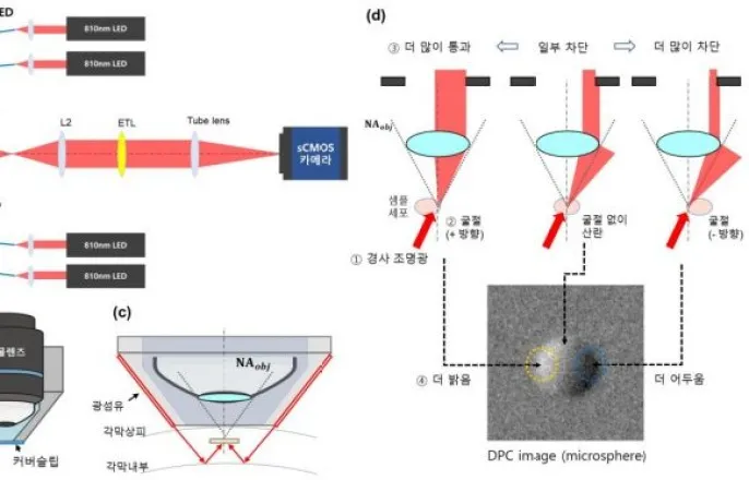 포항공대·서울대병원·중앙대,형광없이살아있는각막고해상도영상구현안구건조증과시력교정수술후회복상태를좌우하는각막신경과면역세포를형광표지없이동시에선명하게관찰할수있는광학영상기술이국내에서개발됐다.살아있는각막에서신경손상과염증반응을동시에추적할수있어안구표면질환진단과수술후회복평가의정확도를크게높일기술로기대된다.한국연구재단은김기현포항공과대학교교수연구팀이윤창호서울대학교병원교수연구팀,김경우중앙대학교교수연구팀과공동으로각막내부의감각신경망과면역세포를비표지방식으로동시에영상화할수있는고성능광학현미경기술을개발했다고9일밝혔다.각막신경및면역세포영상화를위한차등위상대비(DPC)기반광학영상시스템개략도.연구팀제공각막은시력형성의핵심조직으로고밀도의감각신경과면역세포가분포한다.특히각막신경은안구건조증과밀접하고라식·라섹,백내장수술과정에서도영향을받기때문에정밀한관찰이중요하다.하지만기존생체공초점현미경은반사신호기반방식이어서스페클잡음이심하고신경방향에따라신호가달라져신경섬유가끊겨보이는한계가있었다.연구팀은이를해결하기위해차등위상대비(DPC)기반비표지생체영상기술을개발했다.기존반사방식대신세포에의해굴절되는빛정보를영상대비로바꾸는방식으로,각막내부신경망과면역세포를동시에고대비로구현했다.기존방식보다신경섬유가끊기지않고연속적으로보이며,면역세포형태도훨씬선명하게확인됐다.공동연구팀은정상및손상생쥐모델에서기술을검증했다.정상모델에서는각막신경망과면역세포를고해상도로영상화했고,손상모델에서는신경망감소와면역세포증가를정량적으로확인했다.안구건조증,신경영양성각막병증,수술후신경회복추적에직접활용될수있다는의미다.라식·백내장후신경회복추적정확도높인다이번기술은형광염색없이생체상태그대로고해상도3차원영상화가가능하다는점에서임상확장성이크다.연구팀은향후인체적용시스템최적화와임상연구를통해정밀의료진단플랫폼으로발전시킬계획이다.김기현포항공과대학교교수는"형광표지없이생체상태에서신경과면역세포를동시에고해상도로관찰할수있다는점에서의미가크다"며"안구표면질환진단과신경회복추적,말초신경퇴화질환조기진단까지활용범위가넓다"고말했다.이번연구결과는안과분야국제학술지'디오큘러서피스(TheOcularSurface,안구표면학)'2월호에온라인게재됐다.김종화기자[email protected]©아시아경제.무단전재및재배포금지.