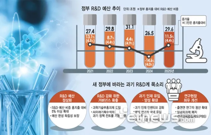과학기술연구개발(R&D)은지난3년동안생태계가훼손된영역으로꼽힌다.대한민국초유의대폭R&D예산삭감사태로연구기관,이공계학생,기업이피해를봤다.반면이재명대통령은후보시절부터R&D예산확대와더불어도전·창의·장기적연구수행환경,연구자목소리대폭반영,이공계핵심인재양성지원등을약속하며'과학기술강국화'비전을제시했다.과기R&D가새정부출범이후바닥을치고반등할지기대가커진다.각계요청도쇄도한다.연구현장에서는쪼그라든예산회복및거버넌스개편등을요구하는목소리가나온다.미래대계를위한인재확보,현장처우개선도요구된다.경제적어려움에직면한R&D기업은세제지원등을,성장이둔화된전국의지역기업은R&D기반성장동력마련시급성을말한다.◇R&D예산,회복넘어정상화필요새정부출범과함께과기계가가장주목한것은R&D예산'정상화'다.지난정부대규모R&D예산삭감사태가연구현장마비수준으로이어진만큼회복을넘어과감한투자확대가필요하다는목소리다.지난정부는비효율적R&D구조조정을명분으로예산을대거삭감했다.지난5년간정부R&D예산추이를보면예산지난해정부R&D예산규모는26조5000억원으로전년31조1000억원대비약14.6%감소했다.2021년27조4000억원,2022년29조8000억원으로점차증가추세를보이던R&D예산이대폭삭감된것이다.정부총지출대비비율또한2021년4.5%,2022년4.4%,2023년4.9%에서지난해4%수준으로떨어졌다.정부출연연구기관(출연연)등연구현장에서는연구중단사태등을이유로곧바로반발했고,이를의식한지난정부는올해R&D예산을29조6000억원으로다시늘렸다.그럼에도여파가계속된다는게과학기술계의한결같은지적이다.과기계는R&D예산비중을총지출대비5%이상규모로즉각확대함과동시에R&D예산편성독립성을보장해야한다고강조한다.이태식한국과학기술단체총연합회(과총)회장은“5년간꾸준한투자로연구현장이장기적이고예측가능한환경에서R&D를수행해야한다”며“기초과학예산,창의적인재육성예산또한반드시늘어나야한다”고강조했다.◇안정성·전문성확보거버넌스필요국가생존전략으로서과학기술역할이강조됨에따라새정부도과학기술을국정운영중심축으로삼고,이를위해거버넌스강화가필요하다는의견이나온다.R&D예산삭감후유증해소역할은물론기존부처별분산된R&D기능을집중체제로전환,과기국정운영안정성·전문성을확보해야한다는것이다.이대통령은후보시절'과학기술부총리제'도입등거버넌스공약을전면에내세우지는않았다.취임후에도다양한이해관계가얽힌거버넌스개편대신연구현장목소리를R&D시스템에반영하겠다는의지를내비치고있다.다만과기계는이런연구현장소통역할로과기부총리등핵심컨트롤타워구축이필요하다고강조한다.이와함께지난정부과학기술수석대신신설된'AI미래기획수석'의범부처과기정책조율역할필요성도함께강조된다.미국백악관의'과학기술정책실(OSTP)'처럼대통령의과기정책을가까운거리에서보좌함과동시에부처과기정책컨트롤기능을수행해야한다는것이다.박찬수과학기술정책연구원(STEPI)부원장은“과기부총리와같이부처별흩어진R&D투자기능을전체적으로총괄조정할수있는거버넌스에대한지속적인고민이필요하다”며“AI수석또한미래지향적인총괄거버넌스형태로발전가능성에기대를거는만큼과학기술공약의실질적이행역할을수행하길바란다”고말했다.◇인재유입·양성전력기울여야국가전반인구문제가가시화된가운데이공계기피및의대선호,우수인재해외유출등으로과기인재확보에도빨간불이켜졌다.이에새정부에서획기적인과기인재유입·양성정책기틀을마련하고,제도적장치를기획해야한다는의견이대두된다.과기인재에대한'경제·사회적인센티브'강화가먼저거론된다.장학금을확대해이공계학생에대한매력도를높이고,산·학·연·정이폭넓게협력해우수대학원생및신진연구자에게최고수준처우를보장해야한다는것이다.해외인재유치필요성도제기된다.미국의'O-1비자'를본딴'코리아O-1비자'제도를마련,탁월한해외연구자들이장기계약으로국내에서연구를수행하도록기반을마련해야한다는주장이다.이와더불어정규직및리더급진출비중이낮은여성과기인재의'유리천장깨기'에나서고,석학정년연장제도등고경력자활용제도도마련해야한다고과기계는말한다.정진호한국과학기술한림원장은“새정부과기정책은담대한인재유입·양성정책에대한강력한의지를담은메시지로부터시작돼야한다“며“새정부에서과기인재를중요시하는정책을궁리하고,설계해주길바란다”고말했다.◇정년확대,PBS개선으로사기높여야연구현장구성원에대한처우개선또한화두다.지난예산삭감사태와'카르텔'논란으로현장의사기가바닥에떨어졌고처우악화가지속됐다.출연연연구자정년을65세로환원하고장기적으로는늘리는한편임금피크제를없애야한다는주장이나온다.연구자가인건비확보를위한과제수주에몰두하게하는'연구과제중심제도(PBS)'문제역시새정부에서정책테이블에올려야할과제로꼽힌다.이들과제는이전정권에서도개선을모색했으나이루지못했던것으로,새정부에서관철에기대를거는이들이많다.김진수출연연과학기술인협의회총연합회(연총)회장은“연구현장이활