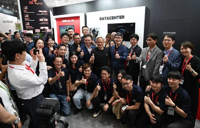 [타이베이=IT동아]젠슨황엔비디아최고경영자가SK하이닉스임직원들과사진을촬영했다/출처=컴퓨텍스공동취재단“매우좋고,자랑스럽습니다.SK넘버원,감사합니다(Sogood,SoProud,SKNumberone,Grateful)”젠슨황엔비디아최고경영자가타이베이난강전람관4층의SK하이닉스부스를방문해남긴짧은문장이다.컴퓨텍스2025는지난20일개막해오는23일까지진행되는세계최대규모의PC하드웨어박람회다.올해행사는인공지능을넘어(AINext)를주제로진행되며엔비디아를비롯해인텔,AMD,퀄컴,Arm,브로드컴등글로벌AI기업들이총출동한다.국내메모리반도체기업으로는SK하이닉스가유일하게부스를열었는데,이를축하하기위해젠슨황엔비디아CEO가깜짝방문했다.SK하이닉스,HBM4비롯한메모리반도체전반소개SK하이닉스는지난해에이어올해도대만컴퓨텍스를찾았다/출처=IT동아SK하이닉스의메모리반도체는일반개인용컴퓨터부터서버용AI가속기까지PC시장전반에서찾는기업이다.이때문에AI반도체의핵심생산국가인대만에메모리반도체를소개할목적으로컴퓨텍스2025에참가했다.SK하이닉스부스는타이베이난강전람관1홀4층N0519a에위치해있으며,지난해에이어올해는규모를더키웠다.SK하이닉스의모바일메모리제품군/출처=IT동아개인용제품으로는스마트폰용LPDDR5X,UFS4.1,그리고데스크톱PC용DDR5메모리가전시됐다.LPDDR5X는노트북및스마트폰메모리로사용되는반도체다.SK하이닉스가생산하는제품은최대10.7Gbps의속도와초당86GB의대역폭을제공한다.일반LPDDR5와비교하면속도는두배,전력효율은8%높다.UFS4.1은저장공간으로사용되는비휘발성메모리로,작은반도체하나에256GB에서최대1TB를제공한다.속도는초당4500MB으로UFS3.1과비교해두배에달한다.함께전시된DDR5메모리도특별한제품이다.현재일반적인DDR5메모리의동작속도는5600MHz이며,이를끌어올린제품도7600MHz정도다.부스에전시된지스킬트라이던트Z5DDR5메모리는동작속도가10000MHz를유지해AI작업이나게이밍시훨씬더빠르게동작한다.오버클록을적용한상태긴하지만,이를유지하는것자체가SK하이닉스반도체의안정성이높음을뜻한다.SK하이닉스의PC저장장치및메모리,그래픽카드용메모리샘플/출처=IT동아PC용저장장치와그래픽카드용메모리도전시됐다.PC스토리지로기재된메모리는AI추론용PC를위한PCB01SSD다.PCB01은최초로8채널PCIe5세대규격을사용해데이터처리속도를크게끌어올렸다.저장공간은512GB에서2TB사이로평범하지만,순차읽기속도가초당1만4700MB,순차쓰기속도는초당1만3400MB에달한다.우측에있는GDDR7은그래픽카드의VRAM으로쓰인다.SK하이닉스의GDDR7은16GB에서24GB구성으로,초당160GB의대역폭과40Gbps의속도를발휘한다.해당반도체는엔비디아블랙웰기반GPU등에탑재되고있다.그아래전시된제품은최신노트북및PC에적용되고있는휘발성메모리규격이다.전시품은SK하이닉스LPCAMM2,CSODIMM,CSODIMM으로다양하다.세메모리모두개인용PC보다는완제품PC에주로탑재되는편이다.서버에탑재되는휘발성메모리및비휘발성메모리제품군/출처=IT동아SK하이닉스에서생산중인다양한서버용메모리도전시됐다.휘발성메모리인서버DIMM에는최대64GB의DDR5RDIMM,최대96GB의DDR5RDIMM,최대256GB의DDR53DSRDIMM이나란히전시됐다.그아래로128GBSOCAMM과최대96GB구성의MRDIMM,최대256GB의DDR5톨MRDIMM이전시됐다.비휘발성메모리는PE9010M.2SSD,PEB110E1.SPCIe메모리,PCIe5세대E3.S&U.2/3에대응하는PS1010u.2/3,PS1012U.2등이전시됐다.젠슨황엔비디아최고경영자가HBM3E및HBM4,그레이스블랙웰슈퍼칩,엔비디아파트너배너에각각서명했다/출처=IT동아그옆으로전시된제품이SK하이닉스의주력반도체인HBM3E및HBM4다.HBM(고대역폭메모리)은여러개의메모리반도체를수직으로쌓아메모리용량을크게늘린제품이다.주요제조사는SK하이닉스와삼성전자,마이크론정도다.이번에전시된HBM3E는단일칩을최대12단으로적층해최대36GB의메모리를제공한다.전송속도는9.2Gbps이상,대역폭은1.2TB를초과한다.SK하이닉스는HBM3E를엔비디아그레이스블랙웰슈퍼칩에독점공급중이다.HBM4는단일칩을최대16단까지적층해48GB의메모리를적용한다.전송속도는약8Gbps며대역폭은2TB수준이다.전력효율측면에서는HBM3E대비38%우수하며,TSMC로직공정을적용한것으로알려졌다.SK하이닉스는지난달에HBM4샘플을주요고객사에제공했고,올해하반기중에양산준비를마칠계획이다.달아오르는메모리반도체시장,한국은SK하이닉스만뜨거워파두의메모리반도체가대만파트너사인에이데이타(ADATA)부스에별다른설명없이전시돼있다/출처=IT동아컴퓨텍스2025에참가하는메모리반도체기업은SK하이닉스이외에도마이크론,키옥시아,웨스턴디지털,에이데이타,킹스톤등이있다.국내기업중파두(FADU)는협력사인에이데이타부스에제품만가져다놨고,삼성전자는메모리반도체가아니라디스플레이부문으로참가했다.전세계내로라하는메모리반도체기업들이글로벌대기업및대만의중견PC업체를공략하느라분주한반면,국내기업은SK하이닉스이외에는큰관심을두지않는모양새다.젠슨황은지난해SKAI서밋2024에서‘SK하이닉스와의협력을통해적은메모리만으로정확하고구조화된연산을처리해무어의법칙을넘어설수있었다.우리는SK하이닉스의HBM이더필요하다’는영상메시지를보낸바있다.전세계가우리나라메