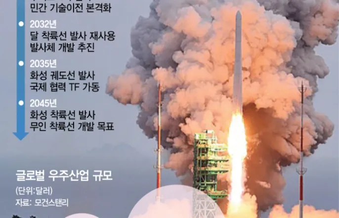 우주항공청1주년간담美,탑재체개발타진에참여모색누리호기술이전협상상반기마무리2028년부터민간형우주수송가동"성과내려면예산2조~3조로확대"[서울경제]정부가2045년화성착륙선발사를위한태스크포스(TF)를꾸렸다.미국이최근화성탐사용대형로켓‘스타십’을중심으로화성탐사를본격추진하는가운데,한국도협력할수있는방안을모색하기위해서다.이를위해단기적으로는국내우주산업생태계를민간중심으로전환하는체질개선도본격적으로추진한다.윤영빈우주항공청장은21일경남사천본청에서열린기자간담회에서“한국은이제막우주경제로향하는베이스캠프를마련한단계”라며이같은청사진을제시했다.윤청장은“현재한국우주산업은여전히위성·발사체중심구조여서정부가주도할수밖에없지만,앞으로는우주의학,자원탐사,위성활용서비스등민간이주도할수있는산업생태계를조성하겠다”며우주개발장기로드맵을발표했다.지난해5월출범한우주항공청은국내첫우주정책전담기관이다.발사체·위성항법·우주탐사등에서국가우주전략의중추역할을맡고있다.윤청장은기술이전을통해국내우주산업을민간주도형으로전환하겠다고여러차례강조했다.누리호가그첫단추다.오는11월예정된한국형발사체누리호4차발사는한국항공우주연구원이주관하고,한화에어로스페이스는기술이전대상기업으로참여한다.한화에어로스페이스는누리호고도화사업의설계,조립,발사,관제등을주도하는체계종합기업이다.2023년3차발사부터발사운용에참여했으며,4~6차발사과정에서는한국항공우주연구원으로부터관련기술을이전받는다.윤청장은“한화에어로스페이스와의기술이전협상은상반기중마무리될예정으로"5차발사부터는독자적으로발사를주도하게할것"이라며"또2028년부터는민간중심의우주수송체계를본격가동할것”이라고말했다.우주산업생태계를재편하는동시에정부는달에서화성으로이어지는20여년의장기우주탐사로드맵을본격추진한다.윤청장은“2032년달착륙선,2035년화성궤도선,2045년화성착륙선발사를목표로하고있다”며“최근미국이고비용발사체(SLS)사용을축소하기로하고,달궤도정거장관련예산을재검토하면서,한국이화성탐사협력기회를조기에확보할수있는여건이조성되고있다”고말했다.실제로최근미국은장기적인달기지구축관련예산을축소하고,화성탐사에힘을쏟고있다.윤청장은“미국이화성탐사선에한국이탑재체를실을수있는지여부를물어왔다"며"이에따라내부적으로태스크포스(TF)를꾸려대응하고있다”고밝혔다.한국이당장화성탐사를위한탐사선이나로켓을개발하기는어려운만큼국제협력중심전략으로한국이실질적인역할을확보하겠다는구상이다.이러한전략을실현하기위해서는예산확대가필수적이다.올해우주항공청예산은9650억원으로,지난해보다27%가량늘어났다.그러나윤청장은“현재우주관련예산은일본은우리의5배,미국은30배수준"이라며"선진국수준의우주성과를내려면연간2조~3조원규모로의예산확대가필요하다”고강조했다.차세대발사체재사용화도풀어야할숙제다.현재우주청은차세대발사체를재사용발사체로전환하기로하고사업변경을위한행정절차를밟고있다.이를통해2032년달착륙선을발사하고,2030년대중반까지발사체를회수한다는계획이다.이를위해서는재사용발사체사업변경허가가일정대로진행돼야한다.사천=서지혜기자[email protected]©서울경제.무단전재및재배포금지.