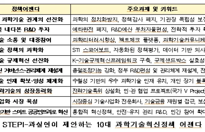 STEPI-과실연,'10대과학기술혁신정책어젠다'발표대선을앞두고과학계단체들이과학기술혁신을위한핵심논의주제로정책감사폐지,예비타당성조사완전폐지,연구개발(R&D)예산부처자율편성등을꼽았다.과학기술정책연구원(STEPI)은바른과학기술사회실현을위한국민연합(이하과실연)과함께두기관이제안하는'10대과학기술혁신정책어젠다'를21일발표했다.어젠다는이날‘대화로여는미래,시민과함께설계하는과학기술혁신’이란주제로열린‘과실연-STEPI공동포럼’에서발표됐다.두기관은먼저‘정치와과학기술관계의선진화’를핵심어젠다로꼽았다.정치가과학기술을수단화하거나편향되게다루는현실을극복하기위해과학기술은정치이념에서독립된합리성과전문성에기반한정책결정이이뤄져야한다는것이다.이를해결하기위해정치개입이가능한정책감사제도의폐지,과학기술기관장의임기독립성보장,여야간과학기술정책선의의경쟁유도등을제안했다.정치와과학기술관계의선진화도어젠더로꼽혔다.두기관은현재연구계가단기성과중심의기획과관리,연구개발(R&D)예비타당성조사등의경제적논리,관료적절차로인해대형·장기R&D성과를위한노력이위축되고있다고주장했다.이를타개하기위해R&D예비타당성조사제도의완전폐지와부처의자율적R&D책임예산편성제도,R&D일몰제개편및프로그램예산도입,전략적국제협력기반의R&D추진등을촉구했다.사회갈등해소를위한과학기술소통및대중참여강화도강조했다.과학리터러시제고,시민과학프로그램활성화,과학저널리즘지원,공론장을통한과학적갈등조정이필요하다고말했다.이어‘과학기술혁신정책의과학화’를언급했다.두기관은“데이터와근거기반의정책기획과추진이더욱필요한시점”이라며“데이터와증거기반으로충실히기획및관리하는정책추진체계가필요하다”고말했다.이를뒷받침하기위해과학기술혁신(STI)스코어보드와같은통합데이터시스템구축,실시간․중장기데이터수집·분석체계,자동화된평가및정책환류시스템등이필요하다고말했다.과학기술규제혁신의선진화가이뤄져야한다고말했다.두기관은“70년대산업화시대에개발된낡은규제가신산업의성장을저해하는심각한문제가있다고판단된다”며시장불신에기반한규제에서벗어나실효성있는규제샌드박스와문제해결중심규제개혁을추진해야한다고제안했다.질적도약을위한과기혁신거버넌스및관리체계재설계도언급했다.특히과학기술혁신에대한총괄·조정기능의강화가필요하고말했다.기존R&D예비타당성조사를대체할새로운R&D편성및관리체계의설계가시급하다고제안했다.과학기술혁신정책의지속성과전략성확보를위해과학기술전담상임위등국회차원의제도개선도필요하다고제안했다.수월성중심의과학기술인재확보〮양성체계화가시급하다고강조했다.우수과학자유치,연구중심대학육성등수월성기반의우수과학기술인재확보정책을보편성·공공성중심의교육정책과분리시키는등의특단의조치가필요하다고주장했다.구체적으로비자,정년,인프라등우수인재유치를위한제도적기반확보및혁신인재테스트베드사업마련,개인장기블록펀딩방식의지원사업도입을제안했다.국가전략기술의성장동력화가이뤄져야한다고강조했다.전략기술특별위원회의상설화,임무이행점검방식구체화등추진체계정비,국가전략기술의성장동력화를지원하는대규모민관협업프로젝트수행,전략기술보호및유출방지를위한연구보안·관리체계강화등을정책대안으로제시했다.기술사업화시장육성도필요하다고밝혔다.연구개발성과의시장메커니즘적용을위한시장중심기술사업화전문회사육성,기술금융재원별접근(출연,투자,보증〮융자등)및최적정책수단조합탐색이필요하다고했다.기술사업화전담조직의권한과책임을명확히하고전문인력·서비스에대해적절한보상을주는보상제도정비등을정책대안으로제시했다.과학기술기반의스마트공공인프라혁신이필요하다고언급했다.두기관은“싱크홀,노후건물화재등의예정된안전사고에대한대응이근본적으로재편돼야한다”며전력망(송배전,해저케이블포함),통신망(사이버안보망),상·하수도등국민삶와직결된핵심국가인프라의분야별전략적기술개발로드맵이수립돼야한다고말했다.안전및유지관리기술개발(R&D)에대한지속적·안정적확대,국가‘스마트인프라’로전환을위한민간참여와역할을확대하는방안모색등을제안했다.[박정연기자[email protected]]Copyright©동아사이언스.무단전재및재배포금지.