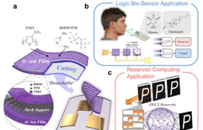 뉴로모픽센서·AI컴퓨팅응용기대(a)제안소자의소자구조도및분리할수있는유기전해질반도체교체개략도(b)바이오센서에응용한고혈압감지회로개략도(c)소자의시냅스특성을활용한레버저컴퓨팅응용한양대학교융합전자공학부유호천교수와부경대학교화학공학부이은광교수공동연구팀이'자유롭게분리할수있고,재사용이가능한유기전해질트랜지스터(DetachableandReusableOrganicElectrolyteTransistor)'를개발했다고3일밝혔다.기존유기전해질트랜지스터(OECT)는소자수명이짧아장기적인사용에한계가있었다.이를극복하기위한재료개발,표면처리,전기적특성최적화등의시도가이어져왔지만,소자의구조적특성으로인해근본적인수명개선에는한계가존재했다.연구팀은이러한기술적난제를해결하기위해반도체를선택적으로교체할수있는모듈형트랜지스터구조를설계했다.이번에개발된반도체는'π-IonFilm'이라는이름으로,내부에금속메시(mesh)지지체를삽입해기계적강도를높였으며,별도의접착제없이다양한기판에부착할수있도록설계됐다.이를통해여러차례의분리·부착과정에서도전기적성능저하없이안정적으로재사용이가능함을확인했다.이처럼자유롭게분리및부착이가능한유기전해질트랜지스터를세계최초로구현함으로써,OECT의수명문제에대한근본적인해결책을제시했다는점에서큰의미를갖는다.연구팀은또한해당소자가이온주입특성에기반해생물학적시냅스를모방하는뉴로모픽소자로도확장가능함을확인했다.시냅스특성을활용해일정횟수이상의신호가감지될경우고혈압을판별하는뉴로모픽센서회로를성공적으로구현했으며,4비트인코딩방식의레저버컴퓨팅(ReservoirComputing)을통해손글씨처럼기존컴퓨터가인식하기어려운이미지도높은정확도로분류할수있음을입증했다.유호천교수와이은광교수는“이번연구는별도의접착제없이부착과분리가가능한유기이온반도체를세계최초로구현한사례”라며“생체신호감지,이미지인식등다양한분야에서의실질적응용가능성을확인했으며,향후저전력·장시간구동트랜지스터,친환경전자플랫폼,차세대지능형센서소자개발을위한전략기술로활용될것으로기대한다”고밝혔다.이번연구는과학기술정보통신부와정보통신기획평가원(IITP)의정보통신방송혁신인재양성(인공지능반도체고급인재양성)사업의지원을받아수행됐다.연구성과는재료및전자소자분야국제학술지'AdvancedMaterials'2025년6월호에정식게재됐다.(왼쪽부터)유호천교수,이은광교수,이원우석박통합과정생해당논문'DetachableandReusable:Reinforcedπ-IonFilmforModularSynapticReservoirComputing'에는한양대이원우석박사통합과정생이제1저자,한양대유호천교수와부경대이은광교수가교신저자로참여했다.최정훈기자[email protected]©전자신문.무단전재및재배포금지.