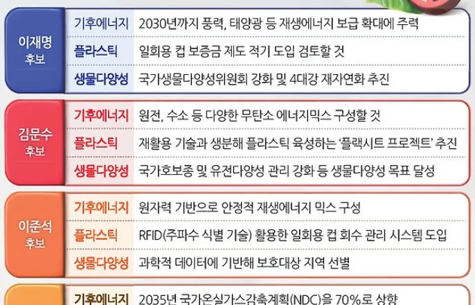 이재명(사진왼쪽부터)더불어민주당대선후보,김문수국민의힘대선후보,이준석개혁신당대선후보.권영국민주노동당대선후보.[연합][헤럴드경제=김광우·김상수기자]“후보님들,환경에는관심없으세요?”어느때보다급히치러지고있는21대대통령선거.제대로된후보자공약을살필틈도없이,본투표날짜가다가왔다.‘정책없는깜깜이선거’라는평가가나올정도.그중에서도유독외면받고있는정책분야가있다.바로‘기후·환경’.인류의미래를좌우할중대사인데도불구하고,좀처럼쟁점에대한후보자들의입장이알려지지않고있다.일부전해지는소식들또한일부후보자들의입장이빠지거나,한쪽의입장만을대변하는경우가대다수.‘기후’를주제로열린후보자토론도관계없는여타이슈로얼룩졌다는평가를받았다.그래서직접질문했다.헤럴드경제는국제환경단체WWF(세계자연기금)와함께환경부문주요쟁점에대한주요대선후보들의입장을물었다.질문은일회용컵규제와환경교육등실생활에밀접한문제부터재생에너지,생물다양성등포괄적인쟁점까지다양하게구성됐다.그간쉽사리환경정책에관한생각을밝히지않던후보들측에서도모두답변에응했다.처음으로유력대선후보측의입장을한눈에볼수있게된셈.이제는투표를앞둔유권자들의몫이다.지난27일오전광주광역시충장로일대게시된21대대선후보벽보.광주=이영기기자.시급한‘탄소중립’…원전이야,태양광이야?탄소중립을위한1순위쟁점은에너지.전기를만들기위해배출되는탄소량이적지않기때문이다.특히우리나라는화석연료를사용한발전비중이60%가넘는다.이에탄소배출량이적은재생에너지확대가가장중요한국가과제중하나로떠오르고있다.대선후보들은모두재생에너지확대의필요성에대해동의했다.하지만방향성은달랐다.이재명후보가풍력·태양력을강조했지만,김문수·이준석후보는원전의중요성을언급했다.권영국후보는공공재생에너지확대를약속했다.서울송파구가락시장채소2동옥상에태양광패널이설치돼있다.[연합]이재명후보는“국가온실가스감축목표(NDC)달성을위해2030년까지풍력과태양광등재생에너지보급확대에주력할예정”이라며소규모태양광발전소증가,영농형태양광용량증가등정책목표를밝혔다.조기완공을위한해상풍력인허가단축도공언했다.김문수후보는원전과함께재생에너지확대의‘효율성’을강조했다.특히고립된전력계통을가진우리나라특성상,수급위험을방지하는에너지안보와함께경제성을고려해야한다고강조했다.김후보는“원전,수소등다양한에너지믹스를구성할것”이라며“재생에너지목표및예산을합리적으로조정해,효율적에너지믹스에이를수있도록역량을집중하겠다”고답했다.신한울2호기원자력발전소.[헤럴드DB]이준석후보는“과거의탈원전정책은비과학적·감성적접근으로전력공급의안전성을헤쳤다”며“온실가스배출이적고단가가낮은원자력을기반으로,재생에너지믹스를구성할것”이라고공언했다.아울러태양광중심의재생에너지확대가각종부작용을초래했다고비판했다.권영국후보는“재생에너지확대의문제를‘기업지원’차원의문제로접근하는것을넘어서야한다”고강조했다.이어‘인센티브’를제공해민간기업이주도하게하는방식으로는탄소중립목표이행이어렵다고언급했다.카페일회용컵,계속써도되는거야?지구온난화및환경오염의주범으로지적되는‘플라스틱’.대선후보들은모두장기적인플라스틱생산및사용감축에동의했다.하지만이를바라보는시각과방향성은조금씩달랐다.특히‘일회용컵보증금제도’에대한의견은크게엇갈렸다.카페일회용컵쓰레기.[헤럴드DB]김문수후보는점진적인접근이필요하다고언급했다.김문수후보는“지속가능한미래로나아가기위한우리세대의실천과제였다”면서도“이해당사자간입장이첨예하게대립해,좀더유연한정책설계와기반시설구축등이갖춰져야한다는교훈을얻었다”고답했다.이어주체가수용할수있는가능한선을찾아‘점진적’으로정책을추진하겠다고밝혔다.이준석후보는기존제도에대해회의적인입장을드러냈다.도입취지에공감하지만,실효성·과학적검증없이강제되는제도로,많은문제가발생했다는게이준석후보의입장이다.그는“기술적대안을함께제시하고,자율적참여를유도해야한다”며RFID회수관리시스템도입등을예시로들었다.분리수거함위에버려져있는일회용컵들(왼쪽사진).환경미화원이음료수컵에남은액체를분리하고있는모습.[헤럴드DB]이재명후보는‘일회용컵보증금제도’에대한의견을묻는질문에“탈플라스틱공약을발표해,자원순환경제의기반을구축하겠다고약속드린바있다”며일회용컵보증금제도적기도입을검토하겠다고밝혔다.다만,자영업자운영부담등현실적인문제도감안하겠다고설명했다.권영국후보는“구체적인계획은없다”면서도제도도입으로특정주체에“부담과피해가없어야한다”며민주적인의사결정을약속했다.‘플라스틱’강국인데…산업은어떡해?플라스틱생산규제에대해서는더큰입장차이를보였다.플라스틱오염을방지하기위해서는생산단계에서의감축이필요하다는의견이나온다.하지만한국은세계4위의플라스틱원료생산국.산업을헤칠수있다