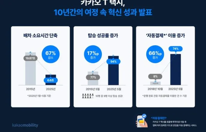 평균배차시간10년전보다67%단출택시호출이용자10명중9.4명탑승자동결제이용률74%넘겨…편의개선지속카카오모빌리티가택시호출서비스10주년을맞아통합모빌리티플랫폼'카카오T'의성과를공개했다.ⓒ카카오모빌리티카카오모빌리티가택시호출서비스10주년을맞아통합모빌리티플랫폼'카카오T'의성과를7일공개했다.카카오T앱데이터를분석한결과,카카오T택시호출후평균적으로택시배차에소요되는시간은10년전과비교해약67%단축됐고,탑승성공률은94%로높아진것으로집계됐다.2019년부터는승차거부없는가맹택시를도입해단거리나운행비선호지역의택시호출수요도대응하기시작했다.카카오모빌리티는서비스출범후부터기술고도화와이용자중심서비스개선을통해'길에서잡는택시'에서'원하는곳으로부르면오는택시'로이동패러다임전환에주력했다.특히택시호출서비스의핵심경쟁력인배차시스템을고도화해카카오T택시의호출-배차-탑승과정의대기시간을최소화했다.실제카카오T택시의평균배차소요시간은올해상반기기준6.6초로2015년19.87초에서약67%단축된성과를보였다.택시호출을시도한승객이실제로탑승해운행을완료한비율을나타내는탑승성공률도꾸준히상승했다.지난5월기준카카오T택시의탑승성공률은2015년77%에서17%p증가한94%를기록했다.카카오모빌리티는2019년가맹택시'카카오T블루'서비스를시작한이후,승차거부없는고품질택시호출서비스를제공해왔다.특히목적지를표시하지않는자동배차시스템을기반으로단거리이동수요는물론운행비선호지역으로의이동수요도효율적으로해소했다.카카오T택시의가맹택시전용호출인블루파트너스호출의2024년기준5km이내단거리평균배차성공률은전체택시호출의평균보다1.2배높게나타났다.또한승객을목적지에내려주고되돌아올때빈차로운행해야해서기피되던,이른바비선호지역에해당하는파주(2.1배),김포(1.9배),강화군(1.5배),하남(1.3배)등에서도가맹택시는전체택시호출대비높은배차성공률을보인것으로집계됐다.카카오모빌리티는승차거부없는가맹택시모델을성공적으로안착시킨데이어승객상황과필요에따라택시옵션을선택할수있도록서비스확장에도나섰다.현재카카오T택시는일반중형택시외에도대형승합·고급택시면허기반의'카카오T벤티',프리미엄택시서비스인'카카오T블랙',모범까지여러택시호출옵션을제공하고있다.특히카카오T벤티와카카오T블랙은원하는일정에맞춰사전에이동계획을세울수있는예약서비스도지원해승객이동편의를높였다는평가를받고있다.결제방식에도많은변화가있었다.카카오모빌리티는2018년10월자동결제기능을도입해탑승부터하차후결제까지원스톱으로제공하고있다.해당기능은카드·현금결제과정에서발생할수있는불필요한마찰을줄이며출시당시부터승객과택시기사모두의호응을얻었다.카카오T택시에서운행완료된건중자동결제이용률은2018년8%에서2025년74%까지증가하며현재대표적인택시운임결제방식으로자리잡았다.자동결제이용률은출시이후지금까지한번도이용률이줄지않고계속해서늘고있는추세다.카카오모빌리티는카카오T택시이용자의편의를보완하는기능을계속도입하고있다.미성년자나고령층의카드등록어려움을해소하기위한'가족계정',외국인이용자를위한'해외카드결제지원'등이대표적이다.류긍선카카오모빌리티대표는"카카오T택시는지난10년간플랫폼기술과데이터,이용자경험의삼박자를통해'길에서잡는택시'로부터'부르면오는택시'라는새로운기준을만들어왔다"며"이용자를위한기술적혁신은물론,지난해택시업계와의상생합의를토대로출범한'지역참여형가맹택시'모델과같이국내택시시장의자체경쟁력도함께높여나갈수있도록지원을아끼지않을것"이라고말했다.Copyright©데일리안.무단전재및재배포금지.
