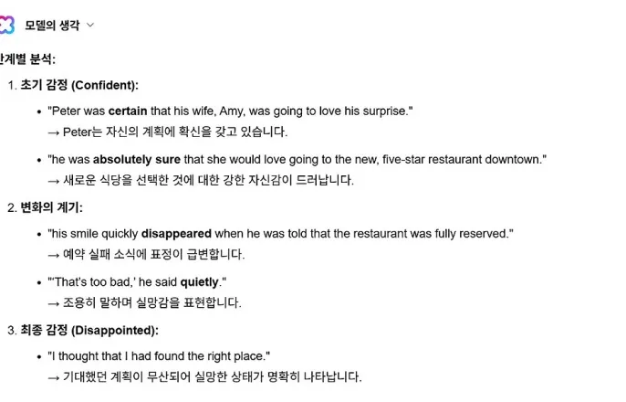 최근개발완료한추론특화모델(하이퍼클로바X씽크),대화형AI서비스에적용AI가어떤추론과정거쳐결론제시하는지확인가능⋯"'에이전트AI'핵심능력갖추며경쟁력"[아이뉴스24정유림기자]네이버의대화형인공지능(AI)서비스'클로바X'에추론에특화된AI기능이추가됐다.수능문제도풀어주는등논리적인결론도출에도움을줄것으로기대된다.지난해치러진2025학년도대학수학능력시험(수능)영어문제(홀수형19번)와관련해네이버의대화형인공지능(AI)서비스'클로바X'의답변예시[사진=네이버]7일네이버에따르면클로바X에추론에특화된AI기능이추가돼논리적인답변을기대할수있다.대화창오른쪽하단에서'스탠다드(일반적인작업에활용)','씽크(THINK·사고,추론에특화)'모델중원하는것을선택해이용하면된다.새기능은추론능력을기반으로언어에대한이해를한층높은수준으로끌어올렸다는게네이버의설명이다.네이버관계자는"추론에특화된모델은논리적사고과정을거쳐보다정교한답변을제공한다"며"복잡한계산부터깊이있는문제분석까지,한층깊이있는대화를경험할수있을것"이라고말했다.실제어떤모델을이용하는지에따라답변에차이가드러난다.지난해치러진2025학년도대학수학능력시험(수능)영어문제(홀수형19번)를제시하고'스탠다드'를선택하니정답과해설을3줄분량의문장으로간략하게요약해제시했다.지문내주인공의심경변화를물은문제와관련해클로바X는"글에서피터는아내에이미에게깜짝선물을준비하면서자신이완벽한것을찾았다고확신하고있었다"며"그러나예약이다차있다는소식을듣고실망하게된다.따라서그의감정은확신(confident)에서실망(disappointed)으로변한것"이라고설명했다.추론형모델을선택했을때는정답을비롯해정답을고른근거,단계별분석,선택지배제(해설)등더상세한내용을제시했다.추론형모델에서의클로바X는피터의감정변화를단계별로분석하고그에해당하는문장을제시하며이를뒷받침했다.클로바X는"초기에주인공은자신의계획에확신을가지고있었다"며"그러나예약실패소식에표정이급변하고,기대했던계획이무산돼실망한상태가명확히나타난다"고분석했다.다른선택지가정답이아닌이유와관련해해설도덧붙였다.가령다른선택지(relaxed→indifferent)와관련해클로바X는"(주인공피터가)초기에'relaxed(편안한)'상태라는근거가없다"며"(주인공피터가)실망한후'indifferent(무관심한)'로변한다는설명도부족했다"고설명했다.정답에대해서는"초기에확신(confident)에서예약실패로인한실망(disappointed)이직접적으로묘사됐다"며"표정변화(smilequicklydisappeared),실망감(toobad)등의표현이감정변화를뒷받침한다"고했다.그러면서"이문제는감정변화의계기와결과를포착하는것이핵심"이라며"지문에서주인공의심리가어떻게변하는지단계별로추론하면쉽게해결할수있다"고덧붙였다.지난해치러진2025학년도대학수학능력시험(수능)영어문제(홀수형19번)와관련해네이버대화형인공지능(AI)서비스'클로바X'의추론내용중일부발췌[사진=네이버]AI가답변을생성하는과정에서'생각하는중'이라는상태를보여주기도했다.AI가어떤추론과정을거쳐결론을제시했는지도상세하게볼수있다.제시한문제와관련해클로바X는7개문단분량의추론과정을거쳐결과물을내놨다.구글의AI'제미나이'등다른일부AI모델에서도추론과정과관련한정보를이용자에제공하는것으로알려졌다.네이버관계자는"AI가추론과정을거치며정보들가운데모순되는부분이나오류는없는지스스로살펴보고이를통해답변의정확도를높이게된다"며"답변이어떤과정을거쳐나왔는지,이용자도파악할수있게제공하는건추론모델의특징을보여주기위한것"이라고설명했다./정유림기자([email protected])Copyright©아이뉴스24.무단전재및재배포금지.