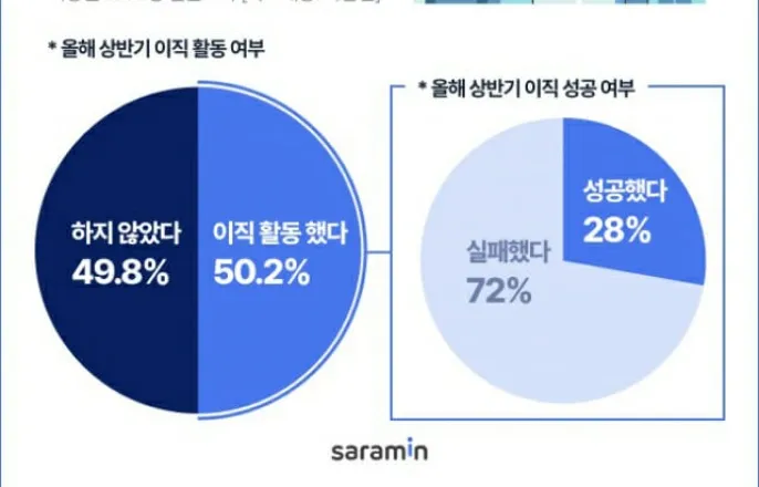 이직활동10명중3명은성공..."적합한직무경험보유덕분"(지디넷코리아=백봉삼기자)직장인절반은올해상반기이직활동에나섰고,이중3분의1가량은이직에성공한것으로나타났다.커리어플랫폼사람인(대표황현순)이직장인1천302명을대상으로‘상반기이직현황’을설문조사한결과,50.2%가‘이직활동을했다’고10일밝혔다.직급별로는대리급(56.2%)·과장급(51.8%)·사원급(51.4%)·부장급(48.1%)·임원급(34.7%)순으로이직활동에뛰어든비율이높았다.기업형태별로는대기업(61.6%)·외국계기업(54.8%)·공기업(51.9%)재직자들이이직활동을많이했고,중견기업(47.3%)·중소기업(49.6%)에서는상대적으로적었다.사람인상반기이직시도조사이들이진행한이직활동은‘채용공고탐색’이80%(복수응답)로가장많았다.다음으로‘이력서·자소서·포트폴리오작성’(65%),‘면접준비’(33.6%),‘자격증준비’(21.7%),‘필기시험또는인적성시험준비’(13%),‘어학시험준비’(8.1%)등의순이었다.이직활동자들중28%는실제로이직에성공했다고답했다.이직준비기간은평균5.6개월로집계됐다.이직성공자의42.6%는현재근무조건보다더나은기업으로상향이직을했다고밝혔다.33.9%는‘비슷한조건’으로이직했으며,23.5%는오히려조건을낮춰이직한것으로나타났다.이직성공요인으로는‘적합한직무경험보유’(74.3%,복수응답)가1위였다.계속해서‘적극적인구직의사홍보’(24.6%),‘성실한이력서,포트폴리오관리’(24.6%),‘꼼꼼한면접준비’(16.9%),‘효과적인인맥,평판관리’(14.8%),‘지원분야자격증준비’(14.8%),‘지원기업에대한철저한분석’(13.7%)등의답변이이어졌다.반면,이직에실패한직장인들(471명)은그이유로‘지원할만한공고부족’(64.8%,복수응답)을가장많이꼽았다.이밖에‘직무경험부족’(20.6%),‘이력서,포트폴리오관리소홀’(20%),‘외국어실력부족’(15.3%),‘지원분야자격증미흡’(15.3%),‘지원기업분석소홀’(13.4%),‘면접준비소홀’(13%)등이있었다.사람인관계자는”직장인들은경력을기반으로한직무역량과평판이평가의중요한기준이되므로,평소근무에최선을다하는한편주기적으로이력서와포트폴리오를정리하고부족한스킬은별도의노력을통해확보해야한다”며“사람인등채용플랫폼에이력서를구직상태로공개하고,주변에구직의사를홍보하는셀프브랜딩도이직성공률을높이는방법”이라고말했다.직장인들은근무할기업을고르는조건으로‘연봉등경제적보상’(71.7%,복수응답),‘고용안정성’(53.1%),‘정시근무시간보장(워라밸)‘(43.7%),‘직무적합성’(39.7%),‘복리후생’(34.5%),‘성장가능성’(33.8%),‘조직문화’(28.9%),‘상사,동료의역량및인성’(28%)등을들었다.백봉삼기자([email protected])Copyright©지디넷코리아.무단전재및재배포금지.