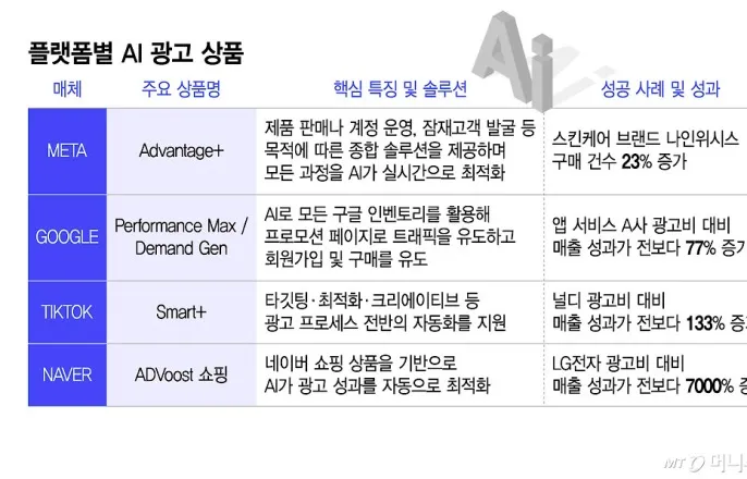 플랫폼별AI광고상품/그래픽=이지혜광고업계에서생성형AI를활용한플랫폼광고상품이떠오르고있다.과거오랜시간이걸리던소비자분석이나잠재고객찾기등을생성형AI가대신하면서비용대비효율성을극대화하는모습이다.6일글로벌컨설팅기업맥킨지앤컴퍼니에따르면지난해전세계기업을대상으로조사한결과AI도입후매출증가율이가장높은영역은'마케팅과세일즈'였다.전세계적으로마케팅은그동안수동설정중심에서실시간자동최적화중심으로변하는모습이다.사람이목표와예산만설정하면AI가적절한타깃과노출지면을선정한다.AI활용마케팅의가장큰장점은성과개선이다.AI가대규모이용자데이터를실시간으로분석해가장높은성과를낼수있도록최적화해주고제작·예산배분·노출위치선정등을자동화해운영을간소화하고리소스를절감해준다.사람이파악하기어려운타깃을예측해고객을확장해주는것도장점이다.또플랫폼이보유한다수의광고채널과지면을하나의캠페인으로통합관리해최적의성과를낼수있는지면을선택하는데도도움을준다.페이스북과인스타그램을운영하는메타는광고상품'어드밴티지+'를운영중이다.제품판매나계정운영,잠재고객발굴등목적에따른종합솔루션을제공하며모든과정을AI가실시간으로최적화해준다.스킨케어브랜드나인위시스는주요채널인올리브영내의판매를증진하기위해이상품을활용했고그결과전보다구매건수가23%증가했다.구글에는'퍼포먼스맥스'상품이있다.이는AI로모든구글인벤토리를활용해프로모션페이지로트래픽을유도하고회원가입및구매를유도하는서비스다.이를활용한비즈니스앱서비스A사는구매고객데이터연동으로광고비대비매출성과가전보다77%증가했다.틱톡은'스마트+'를운영한다.타깃팅·최적화·크리에이티브등광고프로세스전반의자동화를지원해준다.패션브랜드널디는주타깃층인18~24세여성소비자에게도달하기위해스마트+로캠페인운영을자동화한결과광고비대비매출성과가전보다133%증가했다.국내기업중에는네이버(NAVER)의'애드부스트'가눈에띈다.이는네이버쇼핑상품을기반으로AI가광고성과를자동으로최적화하는솔루션이다.네이버에입점한쇼핑몰을연결하면별도위치를등록하지않아도AI가쇼핑상품을이용해위치를자동생성한다.LG전자는애드부스트활용결과광고비대비매출성과가전보다7000%증가했다.광고업계관계자는"과거여러사람이모여분석하던것을이제는AI가훨씬더빠르게끝낼수있어광고업계의호흡도그만큼빨라졌다"며"앞으로는어떤플랫폼이더양질의데이터를많이확보해정확히소비자를분석하느냐에따라광고채널의판도가달라질것"이라고말했다.이정현기자[email protected][머니투데이뉴스속오늘]Copyright©머니투데이&mt.co.kr.무단전재및재배포,AI학습이용금지.