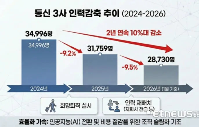 이동통신3사임직원수현황(자료=국민연금공단통계기반생성형AI이미지)SK텔레콤·KT·LG유플러스가인력을2년연속10%가량줄이면서합산임직원수가3만명아래로떨어졌다.이처럼통신사가고강도인력감축에나선것은인공지능(AI)기업으로체질전환을위한조직슬림화기조가이어지고있다.인건비절감효과가반영되며실적이개선될전망이다.3일국민연금가입자데이터를분석한결과올해1월기준이통3사의총임직원수는2만8730명으로집계됐다.지난해같은달(3만1759명)대비9.5%감소했다.2024년1월기준3만4996명에달했던3사임직원수는2025년에9.2%줄어든데이어올해까지2년연속10%에달하는감소세를보였다.작년7월에는합산임직원수가처음으로3만명밑으로내려갔다.기업별로는KT감소폭이두드러졌다.지난달기준KT의임직원수는2년전과비교해26%급감했다.네트워크운용·관리전담자회사설립에따른대규모전출영향이컸다.현재KT넷코어와피엔앰에는약2300명의인력이이동해근무중이다.2024년1만9145명에이르던KT본사인력은이듬해1만6038명으로줄어든데이어올해에는1만4173명까지감소했다.본사는AI중심기술기업으로재편하면서통신망관리인력효율화를꾀한영향이다.SK텔레콤과LG유플러스역시비용절감을위한긴축에나섰다.SK텔레콤은임직원수가지난해5539명에서올해5159명으로줄었다.특히작년말정기인사에서임원수를30%감축하고희망퇴직·직무전환등을통해몸집을줄였다.업계관계자는“SK그룹차원의인력효율화기조에따라계열사단에서추가감축이있을수있다”고말했다.LG유플러스또한2년연속인력을감축했다.2024년1만432명이던임직원수는지난달9398명까지10%가량감소했다.지난해비용절감차원에서희망퇴직을실시한영향이다.이에따라작년3분기1500억원규모의일회성비용이발생했다.통신사의이같은인력감축기조는AI신사업중심으로사업을재편하는과정에서막대한투자비부담을상쇄하기위한자구책으로풀이된다.가입자포화로인한성장정체속에인구감소라는통신산업의구조적한계도작용했다.다만,일각에선무리한인력감축은해킹위협방어,AI사업확장에부메랑이될수있다는우려도감지된다.이통3사비용절감과경영효율화에따라지난해합산영업이익은4조원을넘어선것으로관측된다.올해도인건비절감효과가본격반영되며실적개선을뒷받침할전망이다.한국기업평가는“올해도이통3사의수익안정화전략및기업간거래(B2B)사업중심의매출확대등으로수익성이전년대비개선될것”이라고밝혔다.이통3사임직원수현황(자료=국민연금공단)박준호기자[email protected]©전자신문.무단전재및재배포금지.