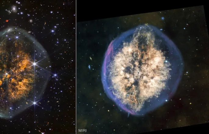 NASA,‘PMR1’성운사진공개우주망원경적외선장비로촬영미국항공우주국(NASA)이25일(현지시간)공개한‘PMR1’성운사진.왼쪽은근적외선촬영장비,오른쪽은중적외선촬영장비로찍었다.NASA제공지구에서5000광년떨어진우주에서투명한두개골을연상하게하는독특한모습의성운이포착됐다.미국항공우주국(NASA)의최신우주망원경이적외선을감지해찍은이사진은향후해당성운의기원과운명을밝히는데중요한역할을할것으로보인다.NASA는25일(현지시간)공식자료를통해자신들이지구밖에서운영중인제임스웹우주망원경으로찍은‘PMR1’이라는이름의성운사진을공개했다.성운은우주먼지와가스가엉켜서생긴일종의구름이다.PMR1모습은기괴하다.투명한두개골형상이다.머리뼈처럼생긴타원속에뇌를연상케하는뿌연물체가담겨있다.좌반구와우반구를가르는뇌속경계선같은검은선도보인다.PMR1은지금은퇴역한NASA‘스피처우주망원경’이2013년찍은적있지만,이번에촬영된사진화질이훨씬좋다.기술발전에따른결과다.NASA가공개한PMR1사진은총2장이다.피사체는같지만,촬영결과물은조금다르다.하나는제임스웹우주망원경에달린촬영장비가운데‘NIRCam’으로찍었다.NIRCam은제임스웹우주망원경으로날아드는우주의빛가운데‘근적외선’영역만쏙쏙골라촬영한다.근적외선은먼지같은장애물을투시한다.NIRCam으로찍은PMR1사진에빛나는별이다수찍힌이유다.제임스웹우주망원경에실린또다른관측장비‘MIRI’로찍은사진은다르다.별보다는성운속먼지가입체감있게자세히촬영돼있다.이는MIRI가‘중적외선’을포착하기때문이다.중적외선은먼지가내는미세한열을꼼꼼히잡아내형태와위치를포착하는효과가있다.NASA는PMR1이생명이거의끝나가는어떤별의마지막모습이라고설명했다.별은빛과열을내는연료,즉수소가바닥을드러내기시작하면자신의외부층을먼지와가스형태로방출하는데,그모습이포착된것이다.NASA는“앞으로PMR1에서어떤일이일어날지는분명치않다”고밝혔다.PMR1을만든별의질량이매우크다면극적인폭발이일어날테지만,태양정도질량의별이라면폭발없이먼지와가스를조용히방출하는일을지속할가능성이크다.어떤상황이벌어지느냐에따라향후PMR1모양새와크기도달라질것으로보인다.NASA는“PMR1은연구가거의되지않은성운”이라며“이번사진이PMR1의세부특징을밝히는데도움이될것으로보인다”고했다.이정호기자[email protected]©경향신문.무단전재및재배포금지.