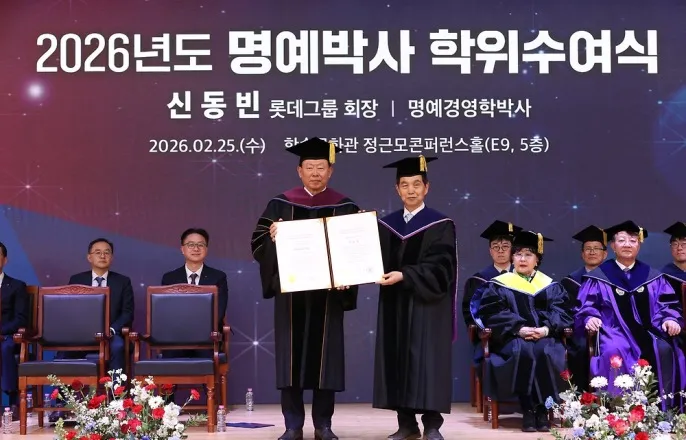 KAIST신동빈회장명예박사수여식“ESG경영핵심삼아책임경영실천과학기술-산업잇는기업새역할제시”辛회장“미래함께설계하는파트너”신동빈(왼쪽)롯데그룹회장이KAIST대전본원에서열린2026년도학위수여식에서명예경영학박사학위를받고있다.[KAIST제공]“산학협력을통한기술과경영의융합은생존전략이다.KAIST와롯데그룹이세상을바꾸는혁신을이어가길바란다.”(신동빈롯데그룹회장)KAIST는25일대전본원에서신동빈롯데그룹회장에게명예경영학박사학위를수여했다고밝혔다.신동빈회장은급변하는글로벌경영환경속에서기업의지속가능한성장을이끌어온대한민국을대표하는기업인이다.롯데그룹회장으로서전통적인유통·소비재중심의사업기반을안정적으로고도화하는한편,화학·소재,친환경에너지,디지털전환등미래경쟁력을좌우할핵심분야에전략적역량을집중해왔다.KAIST는“신동빈회장은기업의성과가사회와분리될수없다는인식아래환경·사회·지배구조(ESG)를경영의핵심축으로삼아책임있는경영을실천해왔다”며“과학기술을기반으로한산업전환과사회적가치창출을제도와실행으로구체화해온점을높이평가해명예박사학위를수여했다”고밝혔다.신회장은KAIST와의산학협력을통해과학기술연구인프라조성과융합연구기반구축에기여해왔다.롯데그룹은KAIST에140억원규모의발전기금을출연해‘LOTTE-KAISTR&D센터’와‘LOTTE-KAIST디자인센터’를설립했으며,이를통해탄소중립기술,바이오지속가능성,에너지·소재,헬스케어등미래사회가요구하는핵심분야에서다학제융합연구가이루어질수있는기반을마련했다.특히이러한협력은연구인프라구축과중장기연구아젠다설정,연구성과의산업·사회확산을연계하는실행형산학협력모델로평가받았다.R&D센터를중심으로한기술연구와더불어,디자인센터는연구성과가사회와사용자에게전달되는과정에주목해기술연구의사회적활용가능성을확장하는역할을수행해왔다.이는KAIST의연구경쟁력강화와함께연구성과가사회적가치로확산되는선순환구조를구축하는데기여했다.신동빈회장은“롯데와KAIST는미래를함께설계하는혁신파트너로서우리의동행이세상을이롭게바꾸는혁신으로이어지길기원한다”고말했다.이광형KAIST총장은“신동빈회장은과학기술과산업,사회적가치를연결하는책임있는경영을통해기업의새로운역할을제시해온인물”이라며“KAIST와의산학협력을통해연구인프라확충과융합연구기반구축에기여한공로를높이평가해명예경영학박사학위를수여했다”고밝혔다.구본혁기자Copyright©헤럴드경제.무단전재및재배포금지.