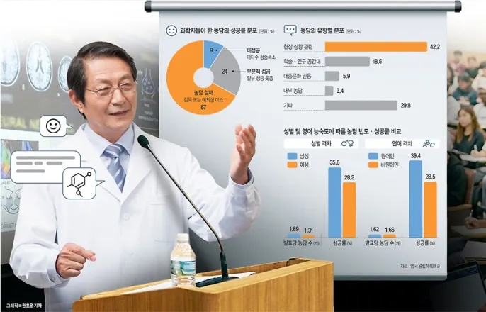 ■국제학술지‘통계적으로유의미한웃음’논문청중과유대형성에좋은도구적기사용땐연구성과더빛나돌발상황대처위한시도최다발표시작과끝부분에집중돼남성·원어민의성공률더높아길고지루한발표가이어지는오전11시47분의어느국제학술대회장,점심시간이가까워지고청중들의눈꺼풀도감겨온다.여섯번째슬라이드,발표자가갑자기농담을건넨다.객석에서일시에웃음이터지면서다들긴장을풀고다시발표자에게귀를기울인다.지난달국제학술지‘왕립학회보B’에발표된논문의도입부다.제목은‘통계적으로유의미한웃음’(Statisticallysignificantchuckles).실제로과학자들은이렇게유머감각을발휘해서학회장을웃음바다로만들까?안타깝게도논문의결론은정반대다.과학자들이건넨농담의67%는사실상실패하고,청중전반을웃긴경우는단9%에그쳤다는것이연구의결론이다.‘과학자는재미없는사람들’이란세간의통념이연구결과에서어느정도는확인된셈이다.과학과유머는어쩌면어울리지않는조합아닐까?논문의저자들은오히려연구성과를한층빛내는유머의가치에주목한다.적절한시기에알맞게사용되기만한다면,발표에서의유머는연결과공동체형성을위한유용한도구가될수있다는설명이다.“균형을맞추는것은어렵지만,성공하기만한다면유머는잊히기쉬운발표를잊히지않는발표로바꿀수있습니다.결국과학은진지해야하지만,과학자들이항상진지할필요는없죠.”이들이내린결론이다.◇과학자농담의3분의2는완전한실패=이탈리아국립연구위원회(CNR)의스테파노마몰라박사와미국콜로라도볼더대의빅토리아스타우트등연구진은2022년부터2024년까지3년동안14개생물학국제학회에직접참석해531개구두발표에서시도된870건의농담을분석했다.이들은농담이성공했는지여부를3단계로분류했는데,사실상‘실패한농담’으로간주되는침묵또는소수의웃음,예의상의미소로끝나는경우가67%에달했다.일부청중이웃음을보이는부분적성공은24%였고,청중대다수가폭소를터뜨리는성공사례는9%에불과했다.학회장은일반적으로청중들이웃음을기대하지않는곳이다보니웃음을이끌어내기도더어려워진다는분석이나온다.870건에이르는농담중가장많은유형은‘상황적유머’로42.2%를차지했다.포인터가고장났다거나슬라이드가넘어가지않는등기술적문제로빚어진즉석상황에대해즉흥적반응을유도하는유머가많았다.특정유형으로분류되기어려운농담이29.8%로뒤를이었고,과학자들간에학술·연구관련공감대를자아내는농담은18.5%였다.대중문화를인용한경우는5.9%,사정을아는사람들이웃을수있는내부농담은3.4%에그쳤다.그러나농담의유형이나전달방식은성공률과유의미한상관관계를보이지않았다.어떤종류의농담을하느냐가아니라누가농담을하느냐가더중요한성공요인이었던셈이다.◇성공적인농담은발표중간에?=농담의타이밍도흥미로운패턴을나타냈다.농담시도는일반적으로발표의시작과끝에집중됐다.발표시간을0(시작)에서1(종료)로표준화할경우농담의타이밍은U자곡선을그린다.그러나성공적인농담만으로한정하면시작·끝에더해중반부에추가적인봉우리가있는패턴을보였다.발표중반부농담은청중의집중력저하를감지하고의도적으로배치했기때문에성공확률이비교적높다는해석이나온다.발표자의경력에따라서도농담타이밍은차이를보였다.학생발표자들은초반에농담을피하고대부분결론시점에농담을시도하는모습이었다.초반에는긴장해서농담을제대로건네지못하지만,발표가진행되면서안정을찾아후반부에농담을시도했다는해석이나온다.경력이많은연구자들도시작과끝에주로농담을건넸다.신진과학자들은멘토로부터‘발표의핵심내용중에농담을삼가라’는조언을받기도했다고털어놨다.◇과학자들의유머도남자가유리=유머에서의성별과언어격차는과학자들사이에서도확인되는현상이었다.연구에따르면남성발표자는여성보다발표당약0.58건더많은농담을건넨것으로나타났다.남성은여성보다,원어민은비원어민보다농담에성공할확률이더높았다.발표자가학생인지,경력이짧거나긴연구자인지등은유의미한영향을미치지않았다.학계비주류인여성들이나영어가짧은발표자들은유머를건넸다가자칫자신의전문성마저의심받는상황에처할지모른다고느끼게된다는해석이나온다.반대로이미학계주류에속하거나언어장벽이없는사람들은신뢰성을의심받을걱정없이편안히농담을던질수있다.이미유리한위치에있는발표자는더적극적인유머를통해호감도를높일수있지만,그결과학계소수자들과의격차는더크게벌어진다.이렇게보면유머는단순히재미있는말을하는기술이아니라학계의사회적역학이복잡하게얽힌결과물일지모른다.유머조차도성별과언어에의해불균등하게분배되는‘사회적특권’이기때문이다.마몰라박사는국제학술지‘사이언스’와의인터뷰에서“남성이정말농담을더잘하는건가,아니면사람들이더기꺼이웃어주는건가”라고되물었다.“농담은위험한행위입니다.과학자는진지해야한다는고정관념이있기때문이지요.그리고위험을감수할수있는능력은공평하게분배돼있지않습니다.”마몰라박사의지적이다.이연구를통해사람들이무엇을얻어가길바라