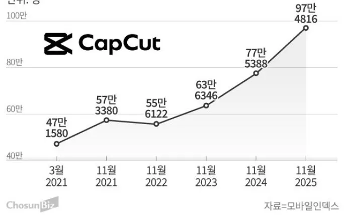 韓MAU4년새2배…11월97만명글로벌사용자3억명,어도비구독자10배“배울필요없다”…숏폼타고대중시장장악그래픽=손민균중국바이트댄스가운영하는동영상편집애플리케이션(앱)‘캡컷(CapCut)’이국내사용자100만명돌파를목전에두고있다.PC기반전문편집툴시장을독점해온어도비가진입장벽과구독료부담으로성장세가둔화되는사이,캡컷은‘직관성’과‘무료’를앞세워일반사용자층을빠르게흡수하고있다.29일앱통계분석플랫폼모바일인덱스에따르면,지난달캡컷의국내월간활성이용자(MAU)는97만4816명으로집계됐다.이는2021년3월(47만1580명)대비2배이상증가한수치다.캡컷은올해5월89만명,10월92만명을기록하며가파른상승세를이어왔고,현재추세라면연내100만명돌파가유력하다.스마트폰으로영상을편집하는국내이용자상당수가캡컷을사실상의‘표준도구’로사용하고있다는의미다.캡컷은모바일앱으로확산됐지만,현재는PC환경에서도존재감을빠르게키우고있다.바이트댄스는윈도와맥OS용데스크톱버전을함께제공하며,모바일에서촬영한영상을PC로옮겨편집하거나PC에서만든결과물을모바일로이어쓰는방식의사용경험을강화하고있다.고사양장비없이도일반노트북에서원활한편집이가능해,유튜브브이로그나소셜미디어(SNS)용콘텐츠를제작하는이용자층까지흡수하고있다는분석이다.이같은캡컷현상은한국에만국한되지않는다.글로벌시장에서도캡컷은이미어도비를압도하는대중형영상편집플랫폼으로성장했다.시장조사업체센서타워에따르면,지난해기준캡컷의글로벌모바일MAU는3억명을넘어섰다.반면어도비의크리에이티브클라우드(CreativeCloud)유료구독자수는전세계적으로3000만~4000만명수준으로추산된다.매출규모에서는여전히B2B(기업간거래)와전문가시장을장악한어도비가앞서지만,실제사용자수기준으로는캡컷이10배가까운격차를벌리며대중시장을장악한셈이다.업계에선캡컷의급성장배경으로‘낮은진입장벽’을꼽는다.어도비의프리미어프로는컷편집이나자막삽입을위해일정수준의학습이필요하지만,캡컷은스마트폰터치몇번만으로도화려한효과를적용할수있다.특히숏폼콘텐츠트렌드에최적화된기능이주효했다.영상소리를인식해자동으로자막을생성하는기능과,유행하는밈(Meme)을즉시적용할수있는템플릿기능은틱톡과인스타그램릴스를즐기는10·20·30대이용자를빠르게끌어들였다.무료버전만으로도대부분의기능을활용할수있다는점역시고가의구독료를요구하는어도비와대비되는강점으로작용했다.어도비제공위기감을느낀경쟁사들의반격도이어지고있다.어도비는지난9월아이폰용‘어도비프리미어’앱을무료로출시하며모바일시장방어에나섰다.워터마크없이AI기능을제공하며캡컷의대항마를자처했지만,이미굳어진시장점유율을단기간에뒤집기에는역부족이라는평가가나온다.페이스북과인스타그램을운영하는메타역시지난4월미국내틱톡규제이슈로캡컷의입지가흔들릴수있다는판단아래AI동영상편집앱‘에디츠(Edits)’를선보였지만,캡컷이법적공방끝에앱스토어에서생존하며영향력을유지했다.어도비는생성형인공지능(AI)기술의확산으로이중고를겪고있다.텍스트명령만으로영상편집과생성을수행하는AI도구들이잇따라등장하면서,기존의복잡한편집소프트웨어의필요성이상대적으로줄어들고있기때문이다.실제로어도비주가는AI발경쟁심화우려속에지난1년새30%이상하락했다.플랫폼업계관계자는“과거에는영상의디테일과완성도가핵심경쟁력이었지만,휘발성이강한숏폼시대에는누가더트렌드를빠르게읽고즉시결과물을내놓느냐가중요해졌다”며“고퀄리티작업을위해긴렌더링시간을들이는것보다,시의성있는콘텐츠를빠르게제작해올리는것이조회수측면에서훨씬유리한구조”라고말했다.-Copyrightⓒ조선비즈&Chosun.com-Copyright©조선비즈.무단전재및재배포금지.