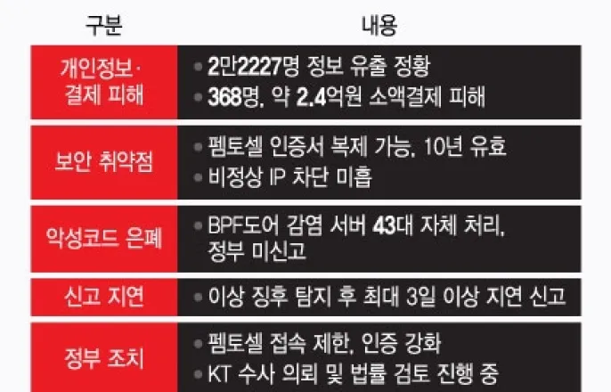 민관합동조사단중간발표지난해43대서버자체조치후미신고·내부망관리도엉망KT,소액결제368명피해…조사단,누락된피해자확인중KT침해사고조사중간결과발표/그래픽=윤선정KT침해사고에대한과학기술정보통신부민관합동조사단조사결과펨토셀(초소형기지국)관리부터내부망인증까지총체적부실이드러났다.지난해악성코드에감염된사실을확인하고도정부에미신고하는등고의로은폐한정황도발견됐다.앞서KT는미국보안전문지프랙이해킹의혹을제기한서버8대중2대를보관중이면서도정부에"폐기했다"고허위보고해과기정통부가경찰에수사를의뢰했다.과기정통부민관합동조사단은6일KT침해사고에대한중간조사결과를이같이발표했다.KT는지난해8월1일부터올해9월10일까지모든기지국접속이력약4조300억건과전가입자의결제건수1억5000건을분석한결과불법펨토셀20개에접속한2만2227명의유심(범용가입자식별모듈)정보(IMSI·IMEI·전화번호)가유출됐고368명이2억4319만원의소액결제피해를입었다고밝혔다.유심인증키는유출되지않아복제폰가능성은없다는입장이다.다만지난해8월이전의통신기록이없어확인이불가한데다불법펨토셀접속기록이없는데도소액결제가발생한사례가나와추가피해가능성도배제할수없다.최우혁과기정통부네트워크정책실장은"KT의피해자분석방식을검증하고누락된피해자존재여부를확인한후최종피해규모를발표하겠다"고말했다.━펨토셀비밀번호10년간동일…소액결제방법은'미궁'━최우혁과학기술정보통신부네트워크정책실장이6일서울종로구정부서울청사에서KT침해사고중간조사결과를발표하고있다./사진=뉴스1KT의펨토셀관리체계가전반적으로부실했던것으로나타났다.모든펨토셀이동일한인증서를사용해이를복사하면불법펨토셀도KT망에접속할수있었다.인증서유효기간도10년이어서한번이라도KT망에접속한이력이있다면언제든재접속이가능했다.내부망인증시에도비정상IP(인터넷프로토콜)를차단하지않고KT망에등록된고유정보인지도검증하지않았다.펨토셀제조사는셀ID,인증서,KT서버IP등중요정보를보안관리체계없이외주제작사에제공하기도했다.펨토셀저장장치에서이를추출하는것도쉬웠다.해커가불법펨토셀로어떻게소액결제를했는지는미궁이다.조사단에따르면해커는불법펨토셀을통해휴대폰과코어망간종단암호화를해제할수있는것으로나타났다.이를통해ARS(자동응답전화)·SMS(단문메시지)의인증정보를평문으로취득할수있었다.이동근한국인터넷진흥원(KISA)디지털위협대응본부장은"종단간암호가해제되는경우는굉장히이례적인케이스"라고말했다.다만소액결제를하려면성명·성별·생년월일등추가개인정보가필요한데이를어떻게확보했는지는밝혀지지않았다.━"안전한KT로오세요"라더니…지난해악성코드감염━KT가고의로사건을은폐·축소하려한정황이잇따라발견됐다.조사단이서버포렌식중악성코드를삭제한흔적을발견하고KT에설명을요청하자뒤늦게지난해3~7월BPF도어·웹셀등에감염된서버43대를자체조치했다고밝혔다.해당서버엔성명,전화번호,이메일주소,IMEI(단말기식별번호)등개인정보가저장돼있었다.BPF도어는SK텔레콤해킹사태를일으킨주요악성코드로과기정통부는지난5월KT,LG유플러스와4개플랫폼사를대상으로대대적점검을실시했다.이때도KT는특이사항이없다고보고했다.최실장은"악성코드감염서버가더확대될가능성도열려있다"며"사실관계를면밀히밝혀관계기관에합당한조치를요청할것"이라고말했다.이외에도KT는무단소액결제와관련,이상통신호패턴(비정상적인접속)을발견하고도3일후에침해신고를하고외부업체보안점검결과내부서버에대한침해흔적이나왔는데도3일뒤에신고한것으로드러났다.과기정통부는KT침해사고에대한엄정한조사를진행하는동시에최종조사결과를토대로이용약관상위약금면제사유에해당하는지검토할예정이다.이에대해KT는"펨토셀관리체계를대폭강화했다"며"통신인프라전반을근본적으로재점검하고고객이신뢰할수있는안전한네트워크환경을만들기위해책임을다하겠다"고밝혔다윤지혜기자[email protected]김승한기자[email protected]©머니투데이&mt.co.kr.무단전재및재배포,AI학습이용금지.