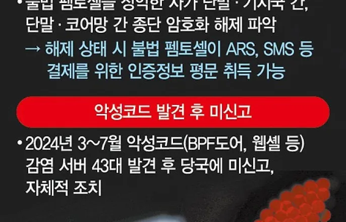 민관합동조사단중간조사결과KT,지난해서버감염사실은폐펨토셀이어서버까지뚫렸다사진=뉴스1지난해악성코드에서버가대량감염된사실을숨긴KT가관련사실을인정하고사과했다.KT는무단소액결제피해·침해사고에대한정부조사에성실히협조하며네트워크안전확보와고객보호조치에총력을다하겠다고밝혔다.정부서울청사에서KT해킹사고를조사중인민관합동조사단은6일중간조사결과에대한브리핑에서KT가지난해악성코드감염사실을숨겼다고발표했다.KT가감염된악성코드는BPF도어(BPFDoor)다.올해초SK텔레콤또한BPF도어를통해해킹된바있다.KT는민관합동조사단의중간조사결과를엄중하게받아들이고악성코드침해사실인지후정부에신고하지않았던것을비롯해무단소액결제관련침해사고에대한지연신고와외부보안업체점검을통한서버침해사실인지후지연신고한사실에대해송구하다고밝혔다.KT는정부합동조사단과관계기관의조사에긴밀히협력해사실관계를규명하는데최선을다할방침이다.KT는펨토셀부터서버까지보안장벽양측이다뚫린셈이다.펨토셀해킹은데이터베이스해킹이아니라신종해킹기법으로꼽혀왔다.인증문자를가로채는식으로해커는통신망자체를공격대상으로삼았다.펨토셀과서버는다른영역이라해킹과정에서공유되는지점도없다.전문가는KT가서버해킹사실을은폐한것을기반으로대기업조차해킹사실을숨기는데급급한실정을지적했다.이성엽고려대기술경영전문대학원교수는"해킹사고가났을때자발적으로신고를유도하는측면도고려해야한다며"과징금등처벌하는식으로제재수위를높여가면두려움때문에해킹사실을쉬쉬할수있다.사후처벌보다사전예방식으로제도설계를변경해야하지않을까"라고말했다.다만이교수는"KT는해당부분에대해진상을밝히고응당상응하는책임을져야된다고본다"고부연했다.해킹사태가반복하는것을두고기업의'땜질처방'을꼬집기도했다.박춘식아주대사이버보안학과교수는"KT는몇년전만해도해킹문제때문에CPO를교체한적있는데또결국반복됐다"며"노력해도막기어려운것이보안문제다.누구하나이사회든지CPO가'보안잘되고있나,보안계획자수립되어있나,예산은적절한가'물어보면달라지지않겠나.사람을바꾸는데그치지말고기업이자율적으로보안에힘을쓰지않으면(해킹피해는)반복된다"고말했다.앞서김영섭KT대표는해킹사태에책임을지고연임을포기했다.KT는허술했던펨토셀관리체계를재설계했다.모든펨토셀의인증서를폐기후새로발급하고인증절차를강화해정상장비여부를매일점검하고있다.또펨토셀이작동할때마다인증을수행하도록해미인증장비는원천적으로망에접속할수없도록조치를완료했다.불법장비의사용을방지하기위해소프트웨어위·변조를감지하는시큐어부트기능을적용하고기기위치의이동도차단했다.또미사용펨토셀의연동을차단하고망접근제어정책을강화하는등확인된취약점을모두개선해유사피해가발생하지않도록관리수준을높였다.문제는이번에드러난사실이펨토셀이아닌악성코드감염이라는점이다.KT는보안위협에대응하기위해외부보안전문가,제조사와의협업도적극추진한다.통신장비의인증부터망접속,서비스연동에이르기까지단계별점검에나설계획이다.KT는보안위협에대응하기위해외부보안전문가,제조사와의협업도적극추진한다.통신장비의인증부터망접속,서비스연동에이르기까지단계별점검에나설계획이다.KT는고객들에게큰불편과우려를끼친점에대해거듭사과했다.KT는"통신인프라전반을근본적으로재점검하고고객이신뢰할수있는안전한네트워크환경을만들기위해끝까지책임을다하겠다"고강조했다박수빈한경닷컴기자[email protected]©한국경제.무단전재및재배포금지.