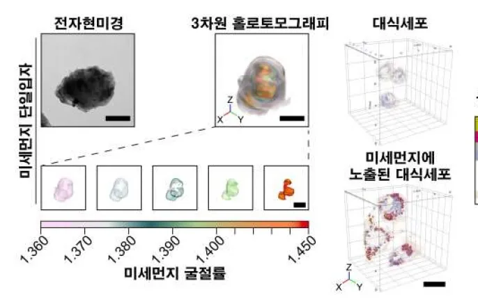 보도기사미세먼지에노출된대식세포확인미세먼지가단순독성입자가아니라세포의대사회로를교란해염증을지속시킨다는새로운연구결과가나왔습니다.한국기초과학지원연구원(KBSI)이성수·황금숙박사연구팀과전남대김성학교수팀은미세먼지가대식세포의지질대사경로를재편성해염증매개물생성을조절하는랜즈사이클을과활성화시키고,이를통해염증반응을지속유도한다는사실을규명했습니다.연구팀은표준미세먼지모델을이용해생쥐대식세포를분석한결과,세포내부로유입된미세먼지가축적되면서지질방울이형성되는현상을확인했습니다.미세먼지가세포구조와대사균형을무너뜨린다는사실을영상으로확인한첫사례입니다.또염증표지단백질과지질방울염색을이용한실시간분석결과,염증이먼저활성화되고이후지질방울이축적되는순차적세포반응이관찰됐습니다.이릍통해미세먼지에의한염증반응과지질대사변화가어떻게연결되는지를영상으로실시간규명했습니다.기존3D홀로토모그래피(3D-HT)기술은세포구조관찰에는유용했지만,세포내대사반응을정량적으로분석하기에는한계가있었습니다.연구팀은3D-HT에다중오믹스(지질체·전사체)분석을결합한멀티모달분석법을새롭게개발했습니다.분석결과,총234종의지질이확인됐고,아라키돈산등염증관련지질대사체가2~3배증가했습니다.또포스포리파아제A2(PLA2)등랜즈사이클관련유전자발현이4~6배이상상승하고,염증유전자발현도함께증가한것으로나타났습니다.형광인지질기질을활용한실시간영상분석에서는PLA2효소가활성화될때리소인지질과자유지방산이2배가까이증가했으며,PLA2억제제처리시염증매개물질인프로스타글란딘생성이절반가량줄어드는것으로나타났습니다.PLA2-랜즈사이클경로가미세먼지유발염증의핵심경로임을입증한겁니다.연구팀은이번성과는미세먼지가인체세포의지질대사체계를교란해염증을유발하는과정을정량적으로규명한것이며,앞으로환경유해입자독성평가와염증성질환연구에폭넓게활용될것으로기대하고있습니다.이번연구논문은환경및독성분야국제학술지,저널오브해저더스머티리얼스(JournalofHazardousMaterials)10월5일자온라인판에실렸습니다.TJB대전방송(사진=KBSI)김건교취재기자|[email protected]©TJB대전방송