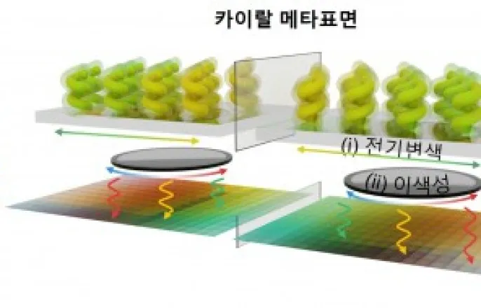 GIST-KAISTGIST연구팀이보석풍뎅이의나선구조를모방해1볼트이하로눈에보이는거의모든색을구현하는초저전력디스플레이기술을개발했다.그림은개발한기술을설명한도식으로카이랄메타표면의색상변화원리를나타낸다.기존대칭구조(좌)와달리거울에비춰도서로겹치지않는나선형카이랄구조(우)는빛의회전방향에따라다른색을구현한다.GIST제공국내연구진이각도에따라무지갯빛으로빛나는보석풍뎅이등껍질의나선구조를모방해1볼트이하의초저전력으로눈에보이는거의모든색을구현하는차세대디스플레이기술을개발했다.광주과학기술원(GIST)은정현호전기전자컴퓨터공학과교수와송영민KAIST교수공동연구팀이전기자극과빛의편광방향에따라색상을정밀하게조절할수있는'카이랄(Chiral)플라즈모닉전기변색메타표면'을개발했다고4일밝혔다.연구결과는국제학술지‘ACS나노(ACSNano)’에10월1일게재됐다.이번연구는보석풍뎅이등껍질의나선구조에서착안해빛의회전방향에따라다른색을내는나선형금나노구조에전기변색고분자를결합했다.이를통해눈에보이는색대부분인287나노미터(nm)파장범위를1볼트이하의저전압으로조절할수있다는점이특징이다.전압과빛의편광방향에따른색상변화다.왼손나선(좌)과오른손나선(우)구조가서로다른색상패턴을보인다.GIST제공전기변색소자는전압을걸면색이변하는기술로스마트윈도우나저전력디스플레이등에쓰인다.그러나기존기술은색변화폭이좁거나고전압이필요해한픽셀안에서다양한색을구현하기어려웠다.연구팀은거울에비춰도서로겹치지않는구조를의미하는'카이랄성(chirality)'과편광에따라색이달라지는'이색성(Dichroism)'을전기변색기술과결합하는새로운접근법으로이문제를해결했다.연구팀은금기반의나선형나노구조체를제작하고그위에전기변색고분자물질을균일하게코팅해전압및편광에따라투과색이달라지는카이랄전기변색메타표면을구현했다.이메타표면은노광공정등복잡한미세가공없는기판에서도손쉽게제작할수있어산업적확장성이높다.제작된메타표면은가시광선영역에서빨강·초록·파랑(RGB)등기본색을포함한거의모든색을구현할수있다.0.25초이하의빠른색상전환속도도보였다.1볼트이하의낮은전압으로구동되며1제곱센티미터당약1.3밀리와트(mW)수준의초저전력으로동작해에너지효율적인색상제어가가능하다.특히한번전압을가해색을바꾼뒤에는전기변색물질의메모리특성으로인해전원을끊어도약15분간색상이유지되는비휘발성메모리효과를나타낸다.1000회이상의반복구동후에도안정적으로색상이변하며제작후1년이지난뒤에도성능저하없이작동해우수한내구성과안정성을입증했다.광논리메모리소자를구현한것으로4개픽셀로구성된메타표면이전압과편광조합으로162가지색상코드를만들어낸다.GIST제공연구팀은이메타표면을4개의픽셀로구성한광논리메모리소자로확장해전압과편광의조합만으로162가지색상조합을구현했다.이는현재대부분의디지털회로나메모리소자가사용하는2진논리를넘어서는3진광논리체계로고밀도광데이터저장과시각정보암호화등차세대광기반정보처리기술로활용될수있는가능성을보여준다.정현호GIST교수는"이번연구는빛의편광성과전기자극을결합한새로운색제어방식을도입한사례로전력소모가낮고색상이선명한차세대광소자패러다임을제시했다"며"향후저전력·고해상도야외디스플레이와광학메모리,보안디스플레이소자에응용될수있다"고설명했다.송영민KAIST교수는"편광에반응하는전기변색소자는AR/VR디스플레이,센서,그리고포토닉컴퓨팅등다양한광기반기술의핵심요소가될수있다"고덧붙였다.GIST는기술이전관련협의를기술사업화센터([email protected])를통해진행할수있다고밝혔다.[조가현기자[email protected]]Copyright©동아사이언스.무단전재및재배포금지.