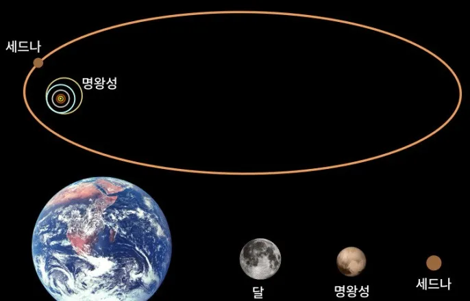윤복원의‘우주의비밀,탐사의미래’지구위협시나리오(7)해왕성에서훨씬먼궤도를돌고있는천체의특이한궤도는제9행성존재가능성을부각시켰다.제9행성이존재한다면태양계내에서만들어졌을가능성과다른별의기원했을가능성이있다.가장좋은천체망원경으로관측한다면1000AU떨어진곳에있는제9행성을관측할수있다.제9행성의중력이태양계외곽의혜성에영향을줘서궤도가변해지구로향한다면지구에는위협이될수있다.그림1.2003년에처음발견한세드나의공전궤도는명왕성의공전궤도보다훨씬크고길쭉하다.21세기에들어서면서카이퍼대근처에서독특한궤도를도는천체들이발견되기시작했다.그출발점은2003년에발견된왜행성급천체세드나(90377Sedna)였다.발견당시세드나는태양에서89.6AU(1AU는지구-태양거리)떨어진곳에있었으며태양과가장가까워지는위치인근일점을향해가고있다.세드나의근일점은76AU로해왕성궤도보다2.5배더멀리떨어져있고,태양에서가장멀어지는위치인원일점은937AU로해왕성보다30배이상더멀리떨어져있다.카이퍼대(Kuiperbelt)가태양에서30~50AU떨어진영역이므로,세드나는카이퍼대밖에서공전한다.현재까지알려진세드나의지름은약900km로,소행성대에서가장큰천체인세레스(1Ceres)의지름940km와비슷한왜행성급천체다.세드나는태양주위를1만1400년에한번씩도는것으로추정되며,공전궤도기울기는11.9도로태양계행성들에비해다소크게기울었다.해왕성너머에서궤도의긴반지름(장반경)이250AU이상인공전궤도를돌고있는천체를ETNO(ExtremeTrans-NeptunianObjects)라고부른다.‘극단적으로해왕성너머의먼궤도를도는천체’를의미한다.세드나를발견한이후ETNO로분류되는여러개의천체를발견했다.이들천체의근일점은카이퍼대보다태양에서더멀리떨어져있고,근일점과원일점의차이가큰긴타원궤도를돌고있다.공전궤도기울기가상당히큰천체들도있다.흥미로운점은ETNO들의근일점방향이특정방향으로모여있는듯한경향을보인다는것이다.ETNO로분류하는천체들의궤도는해왕성에서충분히멀리떨어져있어서,해왕성의중력이이들천체에끼치는영향이상당히적다.그런데도ETNO천체들이독특한공전궤도를돌고있다는것은현재알고있는태양계천체만으로는설명하기어려웠다.그런와중에등장한가설이제9행성(PlanetNine)이다.세드나발견으로시작된제9행성가설세드나의발견은이후제9행성가설로이어지는연구의중요한계기중하나가되었다.근일점이해왕성보다2.5배더먼곳에위치하는세드나의독특한공전궤도도해왕성중력이끼친영향의결과로보기어려웠다.세드나를발견한마이클브라운(MichaelBrown),채드트루질로(ChadTrujillo),데이비드래비노위츠(DavidRabinowitz)는세드나의발견을보고하면서,세드나가현재의공전궤도에자리잡은것은미지의행성이끼친영향의결과일수있다고언급했다.다른별이태양계가까이접근해서현재의세드나공전궤도가만들어졌을가능성과,여러별들사이에서태양계가생성되는과정에서세드나의공전궤도가만들어졌을가능성도함께언급했다.[1]2012년에발견된소행성2012VP113도세드나처럼독특한공전궤도를돌고있음이밝혀졌고,발견자들은태양에서약250AU떨어진곳을공전하는미지의행성이2012VP113의공전궤도에영향을끼쳤을가능성을2014년과학저널네이처논문에서언급했다.[2]시간이흐르면서더많은ETNO가발견되었고,이들의공전궤도를바탕으로제9행성의존재와궤도를추정하려는시도가이어졌다.2021년까지의여러연구에따르면제9행성궤도의긴반지름은약300~520AU,근일점은240~380AU정도로추정된다.이에따라원일점은최대약800AU에이른다.[3]몇몇모델에서는제9행성의질량을지구의5~10배로추정한다.앞으로발견될ETNO들의궤도데이터가계산에추가되면서,추정하는제9행성의공전궤도는계속업데이트될것으로보인다.제9행성이존재하지않을가능성도활발히논의되고있다.그림2.원일점이200AU가넘는태양계천체들의궤도.빨간색궤도는근일점이가설의제9행성의궤도에정렬된ETNO의궤도이고,파란색궤도는제9행성의궤도와정렬되지않은ETNO의궤도이다.그림출처:WikimediaCommons튕겨져나간다섯번째외행성?태양계에포획된외계행성?제9행성이존재한다고가정하면,제9행성의공전궤도로추정되는궤도에는어떻게자리잡았을까?현재의태양계행성궤도를설명하는모델의하나인‘다섯개행성니스모델’(Five-planetNicemodel)에서는초기태양계안에목성,토성,천왕성,해왕성외에다섯번째외행성이존재했고,이행성이태양계밖으로튕겨져나갔다고보고있다.이행성은목성과의근접조우를포함한여러거대행성들과의중력상호작용을거치면서속도가증가해태양계바깥으로튕겨져나갔을것으로본다.속도가증가한원리는보이저1·2호나파이어니어10·11호가목성에가까이지나가면서중력도움항법으로속도를높인것과같은원리이다.만약이행성이태양계밖으로완전히튕겨져나가지못했다면,제9행성이되었을가능성이있다.목성에가까이지나가는과정에서속도를얻어긴타원궤도를돌게되었다면,제9행성의초기공전궤도의근일점은목성공전궤도근처또는그안쪽이었을것이다.공전궤도가태양계행성들의공전궤도가만드는원반에머문다면,이행성은목성뿐만아니라토성,천왕성,해왕성공전궤도근처를가로지른