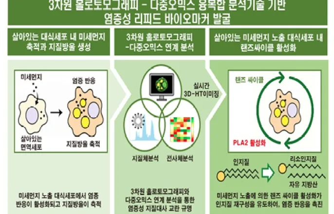 국내연구팀,3차원홀로토모그래피-다중오믹스융복합분석[아이뉴스24정종오기자]미세먼지에노출됐을때지속해염증반응이유도되는것으로나타났다.미세먼지가'나쁨'상태일때는외출을줄이고바깥으로나갈때는마스크등을착용하는것이중요하다는것을말해준다.외출후돌아왔을때는몸을깨끗이씻고공기청정기등먼지를줄일수있도록해야한다.국내연구팀이3차원홀로토모그래피(3D-HT,영상기술)와다중오믹스(Multi-omics,전사체·지질체등분석방법)분석기술을결합한독창적멀티모달분석법을개발해미세먼지에노출된대식세포(주요면역세포)에서지질대사변화와염증활성화간연계메커니즘을규명했다.이번연구는환경유해인자에의한염증지속기전을밝혀낸성과로꼽힌다.앞으로염증완화와치료전략개발은물론생체내유해인자모니터링기술개발에도이바지할것으로기대된다.한국기초과학지원연구원(원장양성광,KBSI)이성수박사연구팀과황금숙박사연구팀,전남대(총장이근배)동물공학과김성학교수연구팀은미세먼지(ParticulateMatter,PM)가대식세포의지질대사를재편성해‘랜즈사이클(Landscycle,지질대사경로)’이라불리는인지질재구성경로를과활성화시키고이를통해염증반응을지속유도함을규명했다.국내연구팀이3차원홀로토모그래피와다중오믹스융합분석을통해미세먼지에노출된살아있는대식세포에서염증반응과지질대사변화를실시간으로규명했다.[사진=KBSI]연구팀은표준미세먼지모델ERM-CZ100(PM)을이용해생쥐대식세포(RAW264.7,Mφ)를관찰한결과,세포내부로유입된미세먼지가축적되면서지질방울(Lipiddroplet)이함께형성되는현상을확인했다.지질방울은세포내중성지방과콜레스테롤에스터를저장하는소기관으로,에너지대사와염증반응조절에관여한다.이러한변화는미세먼지가세포구조와대사균형을무너뜨린다는사실을영상으로입증한첫사례로미세먼지의독성을시각적으로보여준다.염증활성표지자(CDg16)와지질방울염색(BODIPY)을활용한실시간정량분석결과,염증이먼저활성화되고이후지질방울이축적되는순차적세포반응이관찰됐다.이를통해염증과지질대사사이의연계성을실시간영상으로규명했다.기존의3차원홀로토모그래피(3D-HT)기술은세포의형태변화나외부미세입자가세포안으로들어오는과정을관찰하는데는유용했는데세포내대사반응이나세포소기관의미세한변화를정량적으로분석하기에는한계가있었다.연구팀은3D-HT기술에다중오믹스분석(지질체·전사체분석)을결합한새로운멀티모달분석법을개발했다.그결과지질체분석에서총234종의지질이동정됐고염증관련지질대사체가약2~3배증가했다.전사체분석에서도랜즈사이클관련유전자의발현이최대4~6배이상뚜렷하게상승했다.염증관련유전자(Tnf,Ccl2,Ptgs2등)의발현도동반증가함을확인했다.이는미세먼지노출이PLA2효소를활성화시켜인지질을분해하고염증매개물등을과도하게생성하도록유도했기때문이다.이번연구는미세먼지가단순독성입자가아니라,세포의지질대사회로를교란해염증을지속시키는새로운세포내작동원리를제시한것으로평가받고있다.이는장기간미세먼지노출이만성염증성과대사질환으로악화할수있는과정을설명할수있는근거를최초로제시한성과이다.환경오염물질이세포수준에서인체면역반응과대사변화를어떻게유도하는지를규명했다는점에서의의가크다.KBSI이성수박사는“3차원홀로토모그래피와다중오믹스를결합해살아있는세포의염증경로를실시간으로규명한첫사례”라며“이기술은앞으로환경유해입자독성평가와염증성질환연구에폭넓게활용될것”이라고말했다.KBSI황금숙박사는“이번성과는미세먼지가인체세포의지질대사체계를교란해염증을유발하는과정을정량적으로규명한결과”라며“KBSI는국민건강과직결된미세먼지,미세플라스틱,중금속등환경유해인자연구를분석과학의힘으로지속해나가겠다”고전했다.연구결과(논문명:ActivationofLandsCycle-MediatedInflammationinLivingMacrophagesExposedtoLabel-FreeParticulateMatter)에는KBSI황금숙박사,이성수박사,전남대김성학교수가공동교신저자로참여했으며환경과독성분야의국제학술지'JournalofHazardousMaterials'10월5일자온라인으로실렸다./정종오기자([email protected])Copyright©아이뉴스24.무단전재및재배포금지.