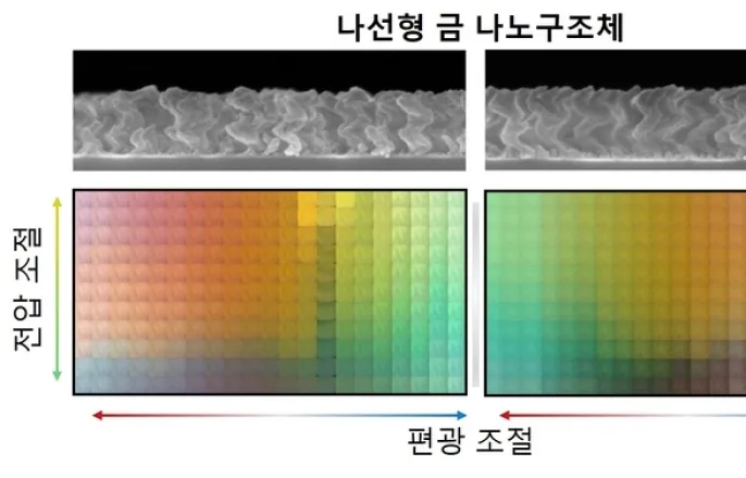 카이랄메타표면의색상구현성능.광주과학기술원(GIST·총장임기철)은정현호전기전자컴퓨터공학과정현호교수와송영민한국과학기술원(KAIST)교수팀이공동으로전기자극과빛의방향(편광)에따라색상을정밀하게조절할수있는'카이랄(Chiral)플라즈모닉전기변색메타표면'을개발했다고4일밝혔다.이번연구는빛이회전하는방향에따라다른색을내는'원형편광'특성을가진빛에반응하는나선형금나노구조에전압을걸면색이바뀌는전기변색고분자를결합해기존기술로는어려웠던넓은색상범위(눈에보이는색대부분인287나노미터(㎚)를1볼트(V)이하의저전압으로조절할수있다는점이특징이다.전기변색소자는전압을걸면색이변하는기술로,스마트윈도우나저전력디스플레이등에활용된다.하지만기존기술은색변화폭이좁거나고전압이필요해,한픽셀안에서다양한색을구현하기어려웠다.연구팀은자연계에서각도에따라색이바뀌는보석풍뎅이등껍질등나선구조의'카이랄성(chirality)'에서착안해빛의회전방향(LCP/RCP)에따라색이달라지는'이색성'을전기변색과결합하는새로운접근법을제안했다.금기반의나선형나노구조체를제작하고,그위에전기변색고분자물질(PANI)을균일하게코팅해전압및편광에따라투과색이달라지는카이랄전기변색메타표면을구현했다.이메타표면은노광공정등복잡한미세가공없이대면적기판에서도손쉽게제작할수있어산업적확장성이높다.한번전압을가해색을바꾼뒤에는전기변색물질의메모리특성으로인해전원을끊어도약15분간색상이유지되는비휘발성메모리효과를나타낸다.GIST정현호-KAIST송영민교수공동연구팀.연구팀은이메타표면을4개의픽셀로구성한광논리메모리소자로확장해,전압과편광의조합만으로162가지색상조합을구현했다.이는기존의2진(binary)논리를넘어서는3진(ternary)광논리체계로,고밀도광데이터저장과시각정보암호화등차세대광기반정보처리기술로활용될수있는가능성을보여준다.정현호교수는“이번연구는빛의편광성과전기자극을결합한새로운색제어방식을도입한사례로,전력소모가낮고색상이선명한차세대광소자패러다임을제시했다”며“향후저전력·고해상도야외디스플레이와광학메모리,보안디스플레이소자에응용될수있다”라고말했다.김영준기자[email protected]©전자신문.무단전재및재배포금지.