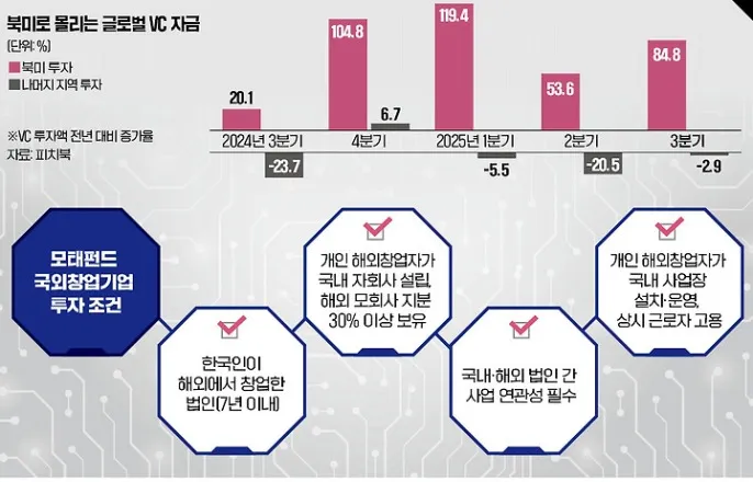 국내에만머무는정책자금해외진출韓스타트업늘지만…정부모태펀드자금벤처펀드의해외소재기업투자비중3%뿐글로벌진출은1년새13%늘어韓벤처자본투자문좁아져아이온큐같은한인창업기업"차라리미VC자금만받자"판단韓정책자금받으면확장에제한‘3%.’정부의모태펀드자금으로조성된벤처펀드가해외소재기업에투자한비중이다.글로벌시장을겨냥해해외로본사를옮기는한국스타트업이빠르게늘고있지만,정책자금의흐름은여전히국내에머물러있다는지적이나온다.지난해정부가국외창업기업투자허용으로제도를일부손질했음에도현장에서는요건이지나치게까다로워실질적으로작동하지않는다는하소연이끊이지않는다.벤처투자의‘속지주의’가고착되면글로벌로성장하는한인스타트업을뒷받침하기어렵고,유망기업에대한투자기회마저놓칠수있다는우려가제기된다.미국듀크대전기컴퓨터공학과·물리학과의이정상교수가창업한양자컴퓨팅스타트업아이온큐에한국벤처자본이투입될가능성은앞으로도크지않을것이라는회의적인전망이나오는이유다.국외기업투자4%에도못미쳐3일한국벤처투자에따르면지난해상반기모태펀드출자펀드의총투자금액은1조2638억원으로집계됐다.이가운데해외소재기업투자는480억원으로전체의3.8%에불과했다.투자기업수기준으로도해외스타트업은26곳에그쳐전체의4.4%에머물렀다.이통계에는순수해외기업과다국적기업의해외법인투자도포함돼있어,한인창업자가설립한‘국외창업기업’만따로보면실제투자비중은이보다더낮을것이라는분석이나온다.그래픽=김하경기자정부역시이런문제의식을인식하고있다.이에따라지난해5월모태펀드운용방향을일부조정했다.그동안모태펀드출자펀드는주목적투자대상을국내벤처기업으로한정해왔고,해외본사를둔기업은사실상부목적투자로분류됐다.법적으로국외창업기업투자가금지된것은아니었지만,주목적투자비율을우선충족해야하는구조탓에실제투자유인은크지않았다는게업계의설명이다.이에정부는해외에본사를둔기업이라고하더라도한국인지분이30%이상이고,글로벌진출전략과기술경쟁력,실질적인매출증가등이확인되면‘주목적투자’로인정하도록기준을완화했다.해외로나간한국창업자의글로벌성장을제도권자금으로뒷받침하겠다는취지였다.그러나제도변화가실제투자확대로이어지지는않고있다는게업계의공통된시각이다.모태펀드출자를받아결성된벤처펀드는결성단계부터투자대상과전략,정책목적을명확히정한약정(LPA)을맺는다.이과정에서상당수펀드는국내기업투자를중심으로설계돼있으며,투자비중과대상역시계약으로엄격하게묶여있다.정부지침이바뀌었다고해도이미결성된펀드의투자전략과약정구조가자동으로수정되는것은아니어서,운용사입장에서는국외창업기업투자를주목적투자로적극확대하는데현실적인제약이따른다는설명이다.사후책임등‘보이지않는벽’사후관리와평가구조역시운용사들의판단을보수적으로만드는요인으로꼽힌다.모태펀드자금이포함된펀드는투자이후에도집행의적정성과정책목적부합여부,관리책임등을지속적으로점검받는다.국내기업은경영참여나사업방향조율을통해일정수준의관리가가능하지만,해외기업은물리적거리와법·제도차이로동일한방식의관리가쉽지않다.그럼에도투자성과와관리책임은같은기준으로평가받아야하는만큼,운용사들이제도변화만으로해외투자에선뜻나서기어렵다는것이다.실무적인장벽도여전하다.영문계약서검토,현지법률·세무리스크,투자이후관리비용부담등이대표적이다.한국내VC임원은“해외스타트업투자는정보비대칭이크고관리난도가높은데,성과가나지않을경우정책자금운용사로서감내해야할부담은훨씬크다”며“굳이리스크를먼저떠안을유인이크지않다”고말했다.해외창업증가세와대조적이같은수치는해외진출스타트업증가세와뚜렷한대비를이룬다.벤처투자분석플랫폼더브이씨에따르면해외에본사를둔한국스타트업은2024년말186개에서2025년말215개로1년새13%이상늘었다.글로벌시장을무대로한창업은빠르게증가하고있지만,이를뒷받침하는국내정책자금흐름은이를따라가지못하고있다는평가가나온다.이런구조는스타트업의선택에도영향을미치고있다.글로벌시장을목표로하는창업자사이에서는정책자금이포함된국내투자를오히려부담으로인식하는분위기도감지된다.미국에진출한한인스타트업대표는“국내투자자는투자논의초기부터규정과사후관리부터언급한다”며“추가투자유치나본사이전같은중요한결정을할때마다다시설명하고동의를구해야해속도가떨어진다”고말했다.그는“글로벌시장에서는속도가경쟁력인데,이런구조라면차라리미국VC자금만으로가는것이낫다고판단하는창업자가늘고있다”고덧붙였다.또다른미국진출스타트업대표는“해외고객과투자자를상대하려면법인구조상국외기업형태가훨씬유리한경우가많다”며“국외창업기업의중요성은커지고있는데,제도는여전히국내기업을전제로설계돼지원의사각지대가발생하고있다”고지적했다.해외진출을선택할수록국내정책자금과의접점은줄어들고,국내자금을선택할수록글로벌확