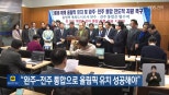 [KBS전주]완주·전주통합을찬성하는11개단체가오늘(5일)전북도의회에모여,두시군통합으로규모를키워2036하계올림픽의유치와개최를성공적으로이뤄내자고주장했습니다.이들은전북도와정치권등이참여하는'전북도정상설회의'와종교계와상공인등으로구성하는'범도민대책위원회'를꾸려함께힘을모으자고제안했습니다.또올림픽유치와개최성공을위해정부가전폭적으로지원해줄것도요구했습니다.