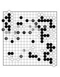 기선전8강○이치리키료9단●박정환9단장면3(107~125)2018년10월한국1위는박정환이었다.59개월연속가장높은자리를지켰다.5년에서딱한달모자랐다.2019년은한해동안한달이멀다하고신진서와1위자리를주고받았다.2020년1월부터1위자리엔신진서이름이대못처럼박혔고오늘날까지6년넘게이어지고있다.박정환1위시대후반부는중국에서커제시대와겹친다.일본은이야마유타시대였다.박정환이1997년커제보다네살위이고이야마보다는네살밑이다.세계대회우승횟수에서는커제가박정환을따라붙고또넘어8번우승했다.박정환이바둑올림픽응씨배에서2회연속금메달을따낼기회를만들어놓고도끝내움켜쥐지못한것이가슴아팠다.세계2강박정환과커제가맞붙었을때관중이구름처럼모였다.한판이기면한판을지고,두판이긴뒤두판을졌다.3연승도한차례씩주고받은상대전적은16승16패.결승전에서는4승1패로박정환이앞섰다.백집은늘지도,줄지도않았다.가운데를휘어잡았던흑세력이큰집으로바뀌기는글렀다.인공지능카타고는기나긴시간동안흑이이길확률을90%넘게잡는다.왜그러한가.박정환은흑세력을집짓기보다백대마를공격하는데썼다.불타오르는사나운공세를펼친것은아니었다.흑11,19에보듯이백대마가가운데로나오지못하게막았을뿐이다.백24에지켰으나이대마가완전히살아있지않다.백18로뛴돌들은흑25가오니아래쪽과손을잡기어려워졌다.[박정상9단]