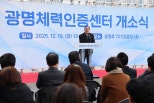19일광명스피돔에서개소식개최체육공단공공체력관리서비스내년1월중본격운영개시하형주국민체육진흥공단이사장이19일광명스피돔에서열린광명체력인증센터개소식에서축사를하고있다.국민체육진흥공단제공서울올림픽기념국민체육진흥공단의대국민공공체력관리서비스인‘국민체력100’을광명시에서도받을수있게됐다.19일경기광명스피돔에서열린광명체력인증센터개소식에는하형주이사장을비롯해임오경국회의원,박승원광명시장,이지석광명시의회의장,유상기광명시체육회장등관계자들이참석한가운데광명시민들을위한국민체력100의새로운시작을축하하는자리를가졌다.광명체력인증센터의신규개소는광명시가지역주민의건강증진을위해추진해온사업이며체육공단은체력인증사업의총괄기관으로서안정적서비스정착을위한지원을제공할계획이다.하형주이사장은“광명센터개소로시민들이과학적인체력관리서비스를받을수있게된것을매우축하한다”며“개소를위해힘써준관계자분들에게깊이감사드리며,최상의서비스를제공할수있는센터가되도록적극지원할것”이라고밝혔다.한편오는1월중본격가동을앞둔광명체력인증센터는전문체력측정장비와인력을기반으로체력측정및인증,운동처방등원스톱건강관리서비스를제공하는지역건강증진거점으로운영될예정이다.