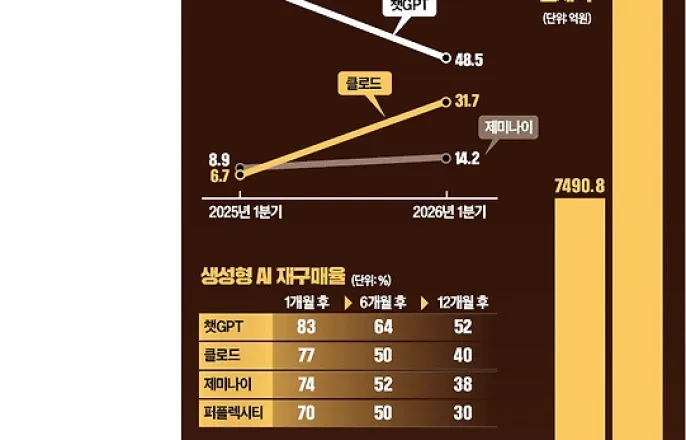 한경Aicel클로드,챗GPT제치고3월韓결제액1위3월결제액1위…韓점유율42%업무에최적화돼기업들선호국내생성형인공지능(AI)시장에서앤스로픽클로드결제액이지난달처음으로오픈AI의챗GPT를앞섰다.기업고객을사로잡은게비결이다.클로드돌풍이본격화했다는분석이나온다.26일한경에이셀(Aicel)에따르면지난달클로드의국내신용카드결제액은495억원에달했다.줄곧국내1위를지킨챗GPT(472억원)를처음으로추월했다.구글제미나이의지난달결제액은137억원이었다.결제액기준시장점유율은클로드가42.4%,챗GPT가40.4%였다.지난해한국어지원을강화하고한국신용카드와원화요금제를내놓은클로드의성장속도는무섭다.지난1월만하더라도클로드결제액은157억원으로,챗GPT(491억원)의3분의1수준이었다.업무용에특화한클로드의수요가기업을중심으로폭발한것으로분석된다.클로드기능을제대로쓰려면가장비싼요금제(맥스20x·월200달러)를이용해야하는데,회사직원들이업무용으로클로드를많이구독했다는설명이다.지난1분기클로드의법인카드평균결제액은18만1000원으로,개인카드(평균6만5000원)보다세배가량많았다.홍세화한경에이셀리서치총괄은“클로드는장기이용자중심고단가매출구조가강화되고있어질적성장세가예상된다”고말했다.법인카드가결제액60%차지,결제건수는16%…성장성커챗GPT·제미나이주고객은개인국내기업들이생산성을높이기위해생성형인공지능(AI)을본격적으로도입하기시작했다.앤스로픽의클로드가지난달국내AI구독시장에서1위로올라서면서나온해석이다.생성형AI가더이상대규모언어모델(LLM)에한정되지않고업무의핵심인프라로안착하고있는것이다.클로드의부상으로국내AI시장은기업고객의클로드와개인고객의챗GPT·제미나이구도로급속히재편되고있다.◇클로드1년새점유율5배↑26일한경에이셀(Aicel)의‘2026년1분기한국생성형AI소비동향보고서’에따르면지난해1분기76.9%에달한오픈AI의챗GPT점유율은올해1분기48.5%로낮아졌다.그대신클로드가같은기간6.7%에서31.7%로크게뛰며따라붙었다.특히이같은기조는지난달클로드가42.4%로높아지며,챗GPT(40.4%)를처음으로앞서며강화되고있다.이같은결과는한경에이셀이2000만명가량의신용카드결제데이터를기반으로보정해산출한결과다.클로드의선전은기업고객에서촉발됐다.올해1분기클로드의월결제액평균은10만5794원으로,챗GPT(4만9105원)와제미나이(3만645원)를압도했다.일반적인개인용구독료가20달러(약2만9000원)안팎임을감안하면,클로드결제액의상당부분이고가요금제에서발생하고있다는얘기다.고가비용은기업에서나왔다.올해1분기클로드의법인카드평균결제액은1년전보다116%높아진18만1000원이었다.클로드의결제주체중법인이차지하는비중은60%에육박한다.개발자들사이에서클로드의코딩능력이다른모델보다정교하다는평가가나오면서클로드는필수재가되고있다.벤처캐피털(VC)멘로벤처스에따르면코딩용AI모델시장에서클로드의점유율은42%로챗GPT(21%)의두배다.이같은소문이퍼지자다른직군회사원들도클로드를구독하고있다.특히회사원들은월20달러의‘Pro모델’이토큰사용량이제한돼업무시끊기는일을경험하고‘Max5x(월100달러)’나‘Max20x(월200달러)’모델등으로옮겨갔다.한대기업직원은“월200달러는개인으로선비싼가격이지만생산성을높일수있는회사입장에선충분히감수할수있는금액”이라고했다.지갑을여는‘우량고객’을클로드가선점했다는얘기다.클로드이용자의재유입률과재구매율도높다.통상구독서비스는시간이지날수록초기이용자가자연스럽게이탈하기마련이지만,클로드는초기이탈자들이서비스고도화시점에맞춰유료결제자로다시유입되는경우가많다는것이다.지난해1분기클로드를결제한이용자의올해3월재구매율은41%에달했다.클로드이용자의잔존율도높은편이다.지난1월결제자의익월재구매율은76.3%,2월결제자의익월재구매율은80.1%였다.한경에이셀리서치팀관계자는“한동안결제를멈췄던이용자들이2월클로드4.6Sonnet등신모델이출시되고,업무적필요성이높아지자재가입하고있다는의미”라고설명했다.클로드의결제액기준점유율은높지만,결제건수기준점유율은16%(지난1분기기준)에그친다.개인고객이많은제미나이가결제건수기준점유율이24%나되지만결제액비중은14%에그치는것과상반된다.그만큼성장가능성이크다는얘기다.◇“올해AI구독료1조원돌파”한경에이셀은이날보고서에서국내생성형AI결제거래가올1분기554만건으로,전년동기보다109%증가했다고밝혔다.이를토대로올해국내생성형AI결제액을1조1670억원으로예상했다.2024년2151억원수준이던시장이2년만에다섯배이상커지는것이다.특히법인결제액이1분기기준1242억원으로전년동기(456억원)보다172%급증한점은생성형AI가기업의고정투자비로자리잡았다는뜻으로해석된다.과거전산인프라나클라우드서비스가그랬듯이생성형AI역시조직의생산성을결정짓는‘디지털필수재’로안착하고있다는얘기다.여기에1분기기준개인결제액이1675억원으로전년동기(753억원)대비122%증가한점도시장성장요인이다.온라인동영상서비스(OTT)와음악스트리밍서비스가소비지형을바꾸며새로운시장을창출한것처럼개인소비자에게AI