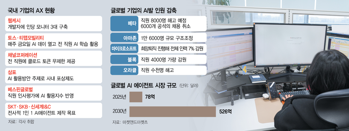 [기업들‘사즉생’AX생존경쟁]금요일마다AI학습시간부여등개별역량높여효율성제고목표직원들,AX필요성엔공감하지만일각“조직생산성과무관”주장일자리위협우려에불안토로도웹케시직원이모니터3대로일반업무와생성형AI·코딩작업을수행하고있다./웹케시기업간(B2B)금융솔루션을제공하는기업웹케시는모든개발자데스크에모니터를3대씩구축하는작업을진행하고있다.기존업무를보는모니터외에다른모니터에서는챗GPT등생성형인공지능(AI)이작동된다.나머지모니터에서는바이브코딩등작업이이뤄진다.모니터3대를설치할공간을재조성하는데만4000만원이투입됐다.최근AI에이전트기업으로탈바꿈을선언한웹케시는직원부터업무중AI를적극활용해야회사가살아남을수있다고본것이다.국내기업들이AI전환(AX)에속도를내고있다.정보기술(IT)기업뿐만아니라전통제조기업까지지금AX시기를놓쳤다가는생존이어려워질수있다는위기감을느끼고있어서다.다만직원들은AX필요성에공감하면서도한편으로는일자리가위협받을수있다며불안감을토로한다.AI가노동시장을강타하기시작한만큼이에따른충격을최소화하기위한대책이필요하다는지적이나온다.26일산업계에따르면토스와티맵모빌리티는매주금요일전사적으로AI데이를개최하고있다.토스는이달10일부터매주금요일‘AI서프(Surf)데이’를열고희망자에한해업무대신AI를활용해보도록하고있다.개발자뿐만아니라비개발자인직원들이자유롭게AI관련모임을결성하고AI를배우고결과물을만든다.티맵모빌리티역시매주금요일오후를‘AI시프트(Shift)데이’로정하고전직원이AI를학습,실습하도록운영중이다.AI비즈니스메신저‘채널톡’의운영사채널코퍼레이션은최근전직원이앤스로픽의AI서비스인클로드에서토큰(데이터처리단위)을무제한쓸수있도록허용했다.회사가올해2월말직원들에게클로드의프리미엄플랜등급을제공했지만토큰이부족하다는의견이나오면서아예제한을풀어버린것이다.그결과코딩경험이전혀없던사내카페바리스타까지바이브코딩으로키오스크주문애플리케이션을제작했다.이경훈채널코퍼레이션최고인공지능책임자(CAIO)는“직원한사람당AI비용이해당인건비를초과하는경우는드물고오히려개인의생산성이두배이상향상되는사례들이많이나오고있다”며“비용을절감하기위해토큰사용을제한할경우새로운시도가줄수있어현재로서는토큰사용을제한할계획이없다”고말했다.이는대기업도마찬가지다.SK텔레콤,SK브로드밴드,신세계I&C는올해사내목표로‘1인1AI에이전트제작’을정하고관련교육을강화하고있다.포스코DX도3월부터AI기초부터AI에이전트기획설계개발까지학습하는‘AX아카데미프로그램’을운영하고있다.이를통해상반기까지약400명의AI에이전트전문가를양성할계획이다.중견기업인베스핀글로벌은직원들이만든AI에이전트의생산성을평가하고기준미달시퇴출하는방안을도입할예정이다.올해상반기부터직원인사평가에AI활용지수도반영된다.건설기초소재기업인삼표그룹은임직원이래미콘압축강도조기예측,물류실시간배차최적화등현장문제를AI로해결하도록‘사내AI포상제도’를내걸었다.국내기업들이일제히AX에승부수를건데는제때AX를하지않다가뒤쳐질수있다고보기때문이다.챗GPT,제미나이,클로드등AI기술이빠르게발전하면서기존시장을지배했던어도비,오라클등기업까지흔들리고있다.각종업무에AI를접목해직원개인뿐만아니라회사전체의생산성,효율성을높여야살아남을수있다.업계의한관계자는“PC와스마트폰이시장의패러다임을바꾸고혁신을이끌수있었던건개인단위에서활발하게사용했기때문”이라며“AI에이전트도시장판도를또한번흔드는계기가될것”이라고언급했다.다만개인의AI역량강화가회사전체생산성향상으로반드시이어지는건아니라는주장도제기된다.조직생산성을높이는방향으로AX를선별하는작업이필요하다는것이다.AI발일자리대체에대한우려가큰점도숙제다.실제로메타,아마존,마이크로소프트등빅테크는AI로단순업무가가능해지면서상당규모의인력을해고하고있다.김현철한국인공지능협회장은“잘개발된AI에이전트는해당직원이퇴사해도회사는상관없을정도로발전할것”이라며“몇년이걸릴지모르겠지만주니어뿐만아니라시니어도대체되고최종적으로자본가등의사결정권자만남게될것”이라고내다봤다.기업의AX가노동시장에미칠영향을생각해야하는이유다.최경진가천대법학과교수(인공지능·데이터정책연구센터장)는“결국몇몇직업은AI가대체할텐데이에대비한재교육을기업들이지금해주고있는셈”이라며“AI로하위직은대체되고그효율성은상위직이느끼는구조가형성되는데,이때사람들에게덜충격이가해지도록고민해야한다”고주장했다.김지영기자[email protected]이진석기자[email protected]©서울경제.무단전재및재배포금지.