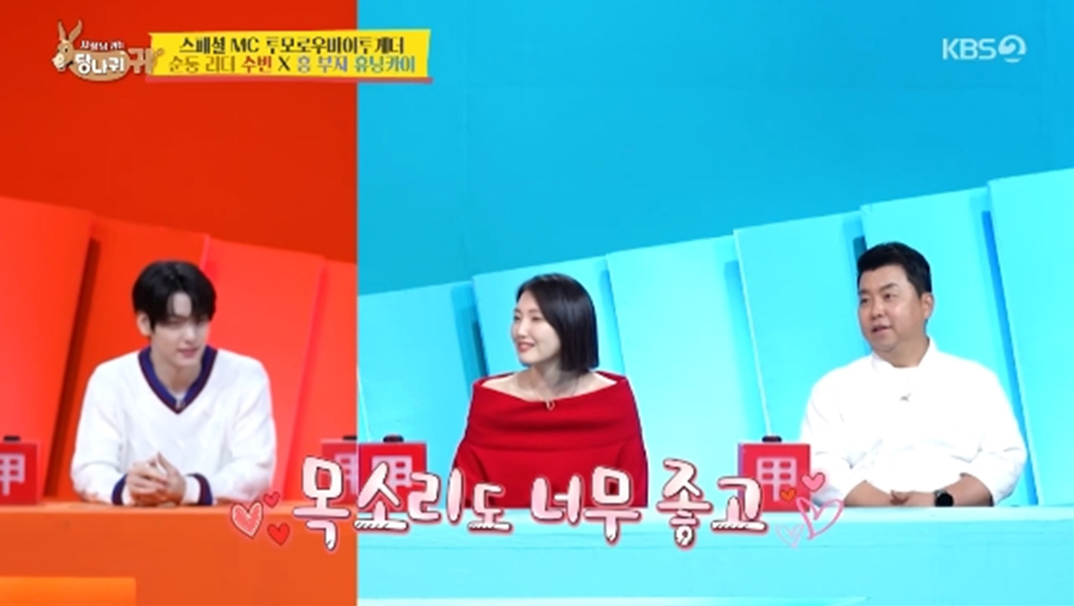 '사장님귀는당나귀귀'방송화면캡처(엑스포츠뉴스원민순기자)옥상달빛김윤주가투모로우바이투게더수빈,휴닝카이를향한팬심을고백했다.26일방송된KBS2TV'사장님귀는당나귀귀'에서는김윤주가투모로우바이투게더를향한팬심을고백하는모습이전파를탔다.이날전현무는"대한민국에3대빈이있다고한다.원빈,현빈,그리고수빈이다"라고말했다.스페셜MC로등장한수빈은전현무의얘기를듣고부끄러워하며고개를숙였다.김윤주는투모로우바이투게더멤버들을보면서"너무기분이좋다.'사당귀'나오고제일좋은날인것같다"고팬심을드러냈다.박명수는전현무에게"그동안우리만봐서얼마나짜증났겠느냐"고김윤주를이해하는모습을보였다.김윤주는"목소리도너무좋고옆모습도너무좋고"라며꿀이뚝뚝떨어지는눈빛으로투모로우바이투게더멤버들을쳐다봐웃음을자아냈다.사진=KBS방송화면원민순기자[email protected]©엑스포츠뉴스.무단전재및재배포금지.